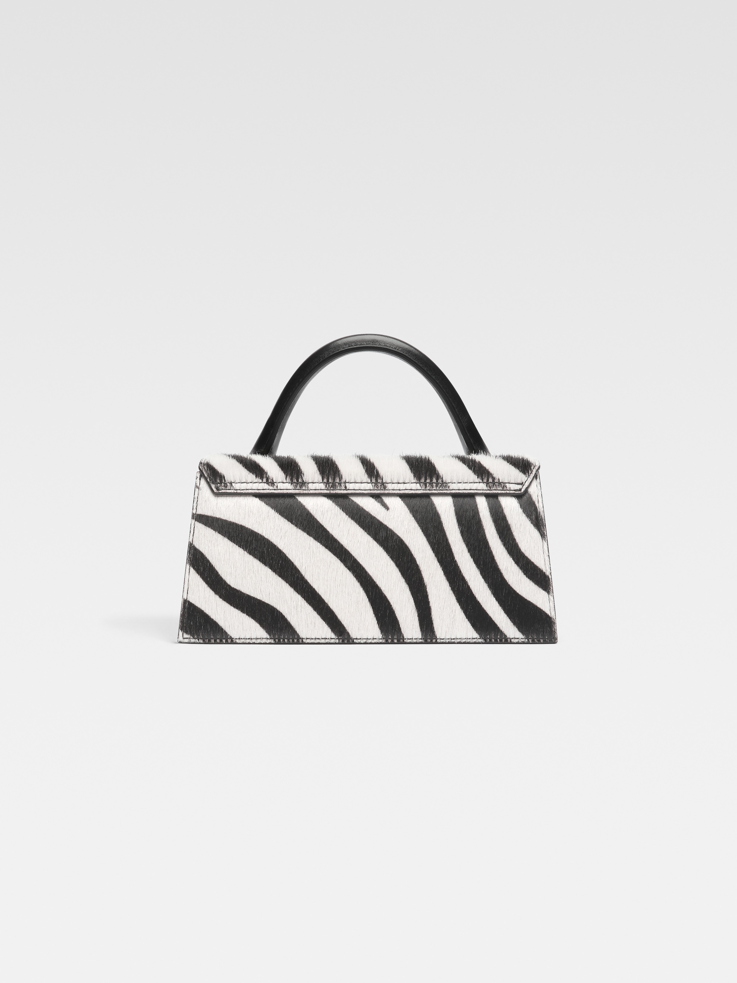 LA CASA Elongated signature handbag - Zebra-printed calfskin pony-hair structured bag - Reinforced handle - Magnetic flap closure - Long removable shoulder strap - Engraved lobster clip - Interior pocket - Gold-plated logo and hardware - Fully lined in cotton - Dyed edges - Length: 22cm - Height: 10.5cm 100% Cotton Made in Italy Ref. 213BA004-3209-9DZ