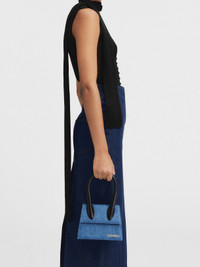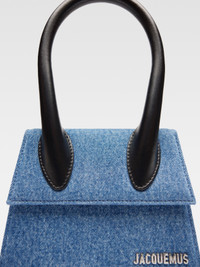 LES SCULPTURES Signature denim handbag - Structured denim bag - Reinforced handle in leather - Magnetic flap closure - Removable, adjustable shoulder strap - Engraved lobster clip - Interior pockets - Silver metal logo and metalwork - Fully lined in cotton - Painted edges - Length: 18 cm - Height: 13.5 cm 100% Cowskin / Lining: 100% Cotton Made in Italy Ref.213BA002-3176-330