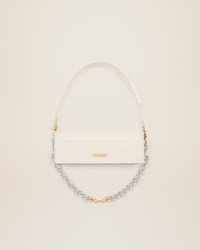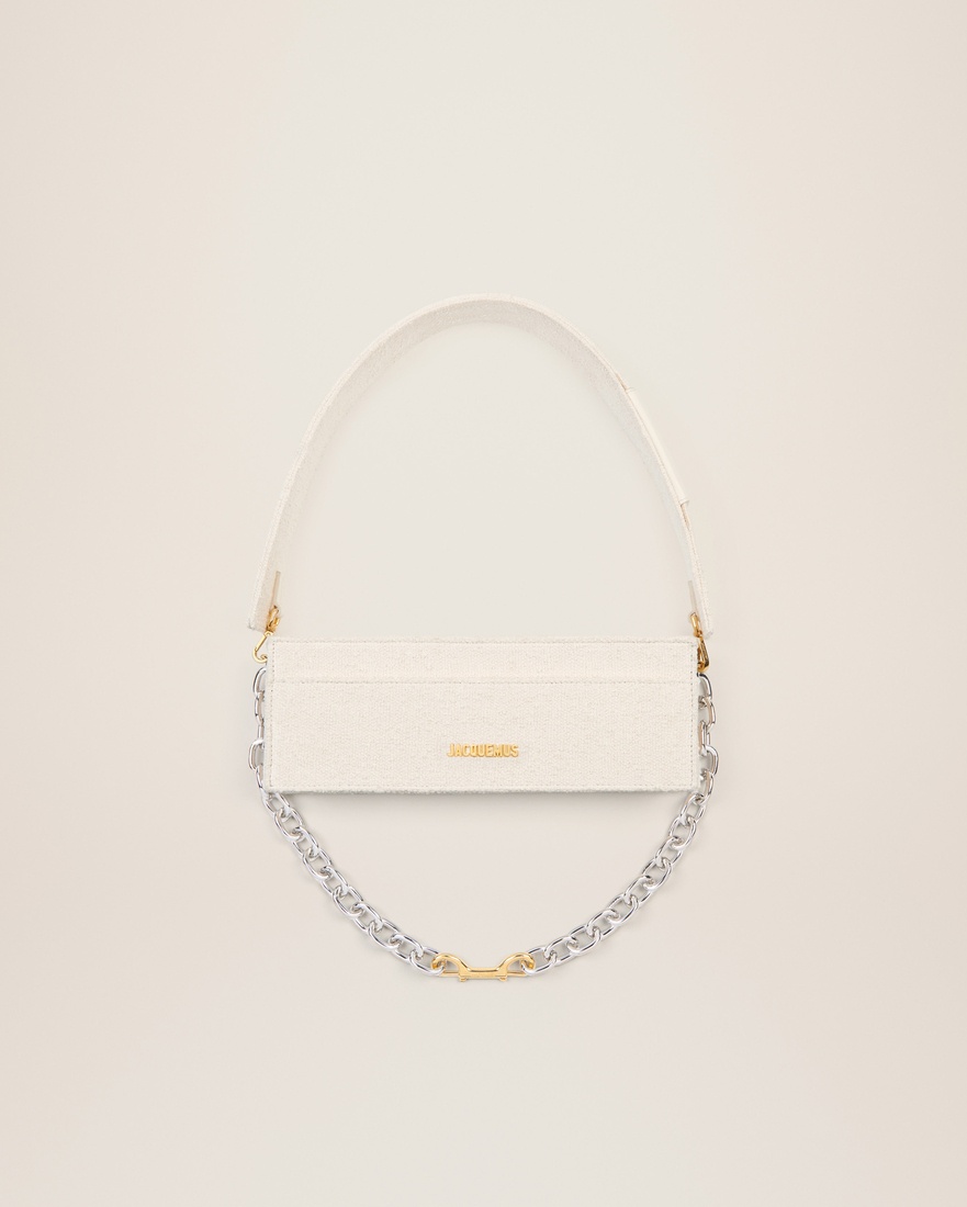 LE PAPIER Rectangular box bag - Textured cotton shoulder bag - Long exterior front pocket - Zip closure - Removable strap with snap closure card holder - Removable silver metal link chain with double gold metal spring clasp - Interior pocket - Gold metal logo and engraved hardware - Dyed edges - 30 x 10.5 cm 90% Cotton - 10% Polyamide/Nylon Made in Italy Ref.213BA009-3078-110