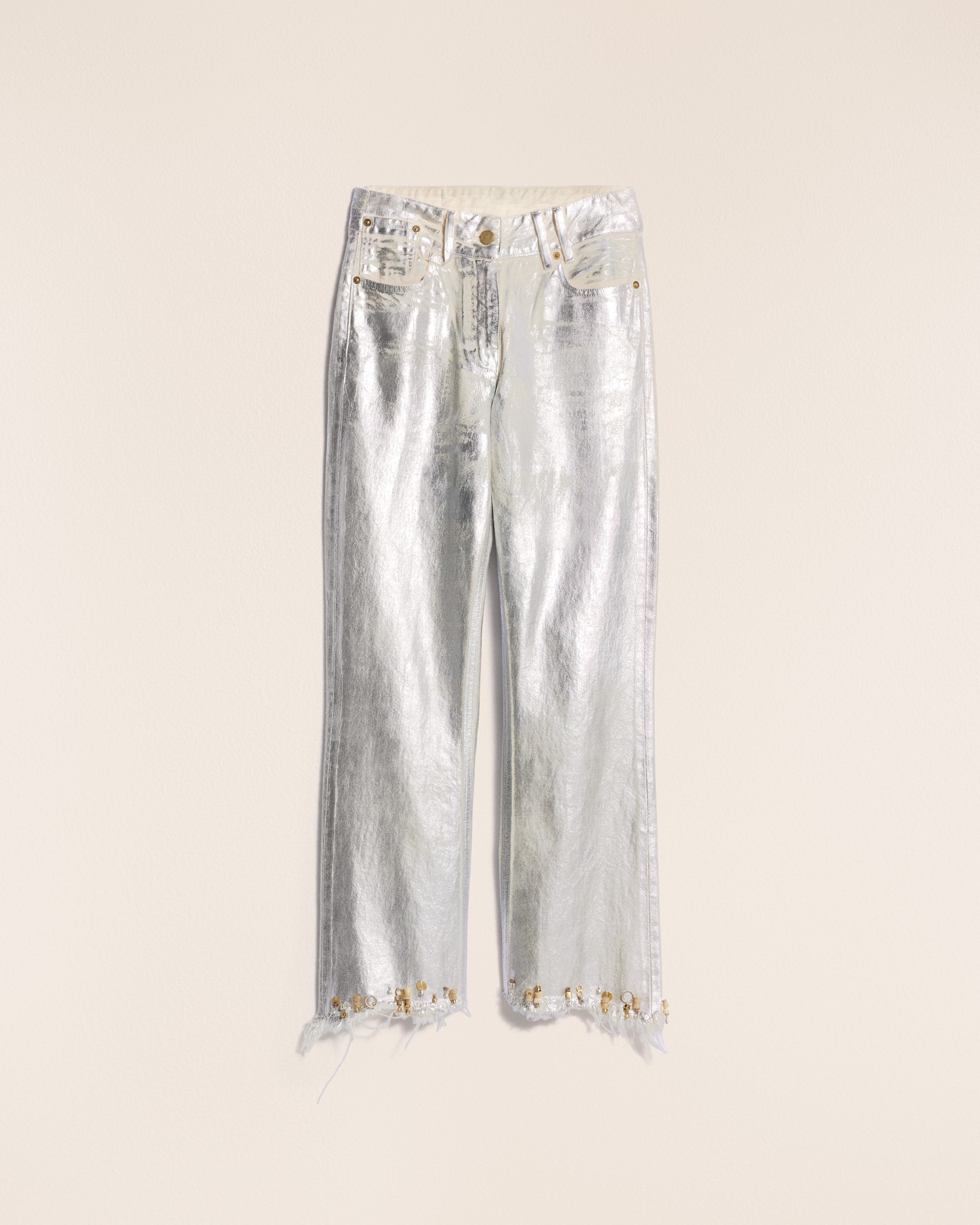 Le Raphia Fringe jeans - Mid-rise - Ankle length - Cotton denim washed with indigo thread - Fitted at the hips and slightly flared at the hem - Five pockets - Asymmetric frayed hem - "J" loop detail - Hidden zip closure with engraved button - Inlaid and frayed back pockets - Paper logo denim patch on the back The model is 180 cm and wears a size 24 100% Organic Cotton Made in Portugal Ref.231DE015-1016-980