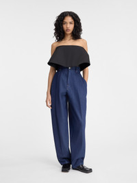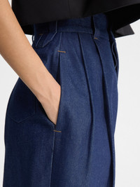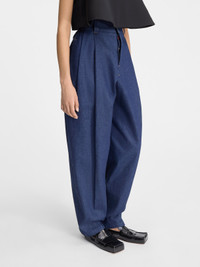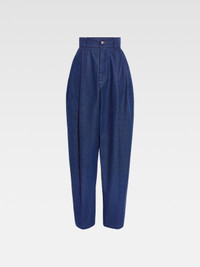 LA CASA Ultra high-waisted jeans - Loose, extra high-rise fit - Raw indigo denim - Belt loops with "J" loop on back - Contrast denim stitching with red detail - Button fly with one red button - Slant pockets - Pressed pleats - Wide, tapered legs - Back patch pockets - Engraved silver metal buttons The model is 178cm and wears a size 24 100% Cotton Made in Italy Ref. 243DE055-1513-380