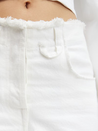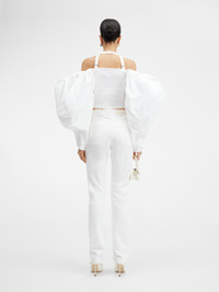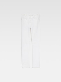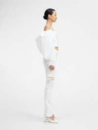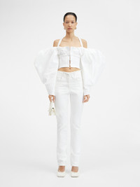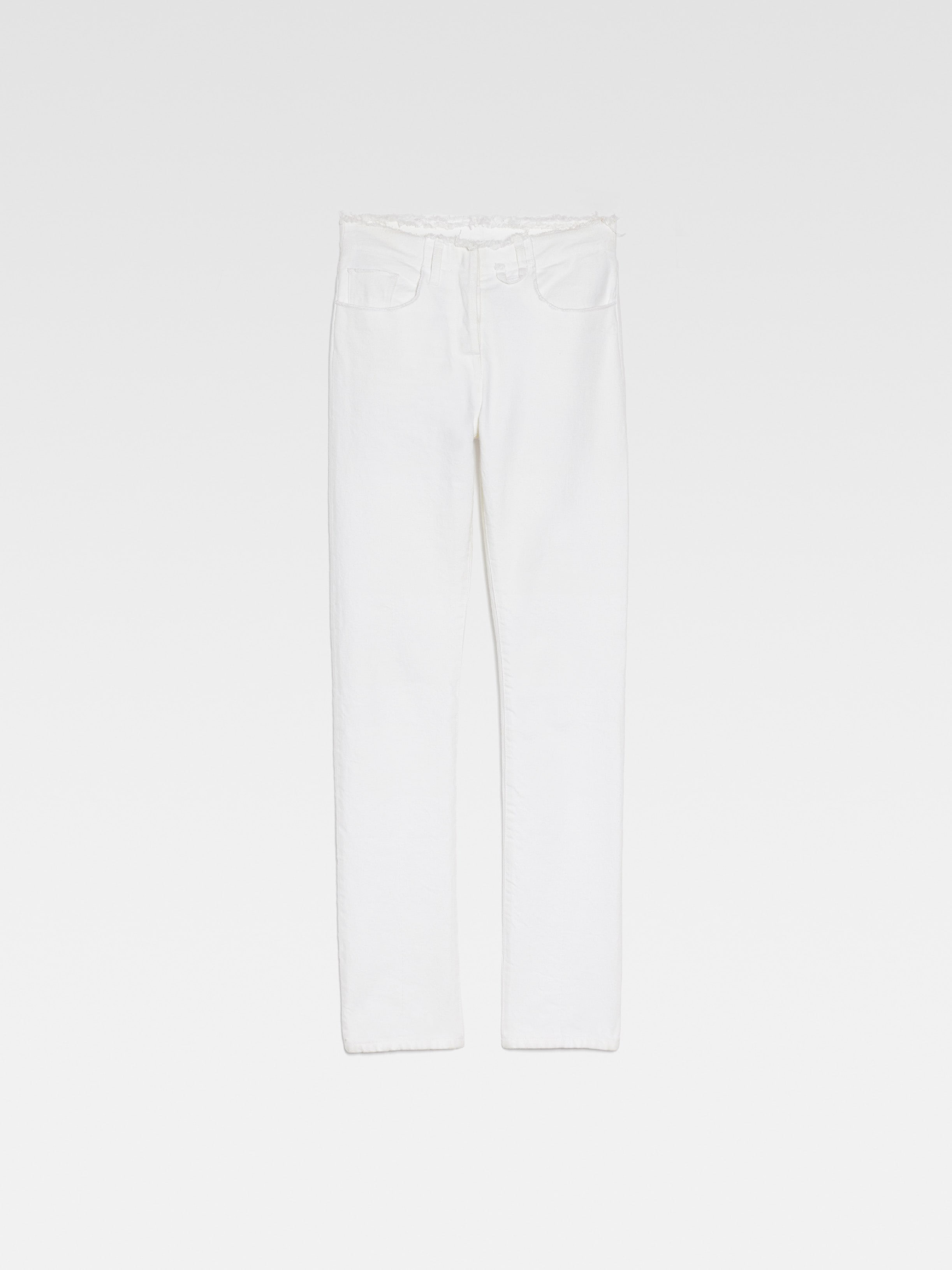 LE CHOUCHOU Frayed jeans - Low rise - Garment-dyed denim - Long straight legs with central stitching - Contrast stitching - Frayed waistband - Hidden zip and button closure - Five pockets - “J” loop detail - Grosgrain logo ribbon on the back The model is 179 cm and wears a size 24. 100% Regenerative cotton Made in Italy Ref.233DE030-1016-100