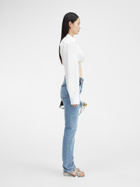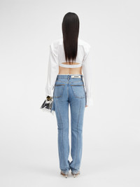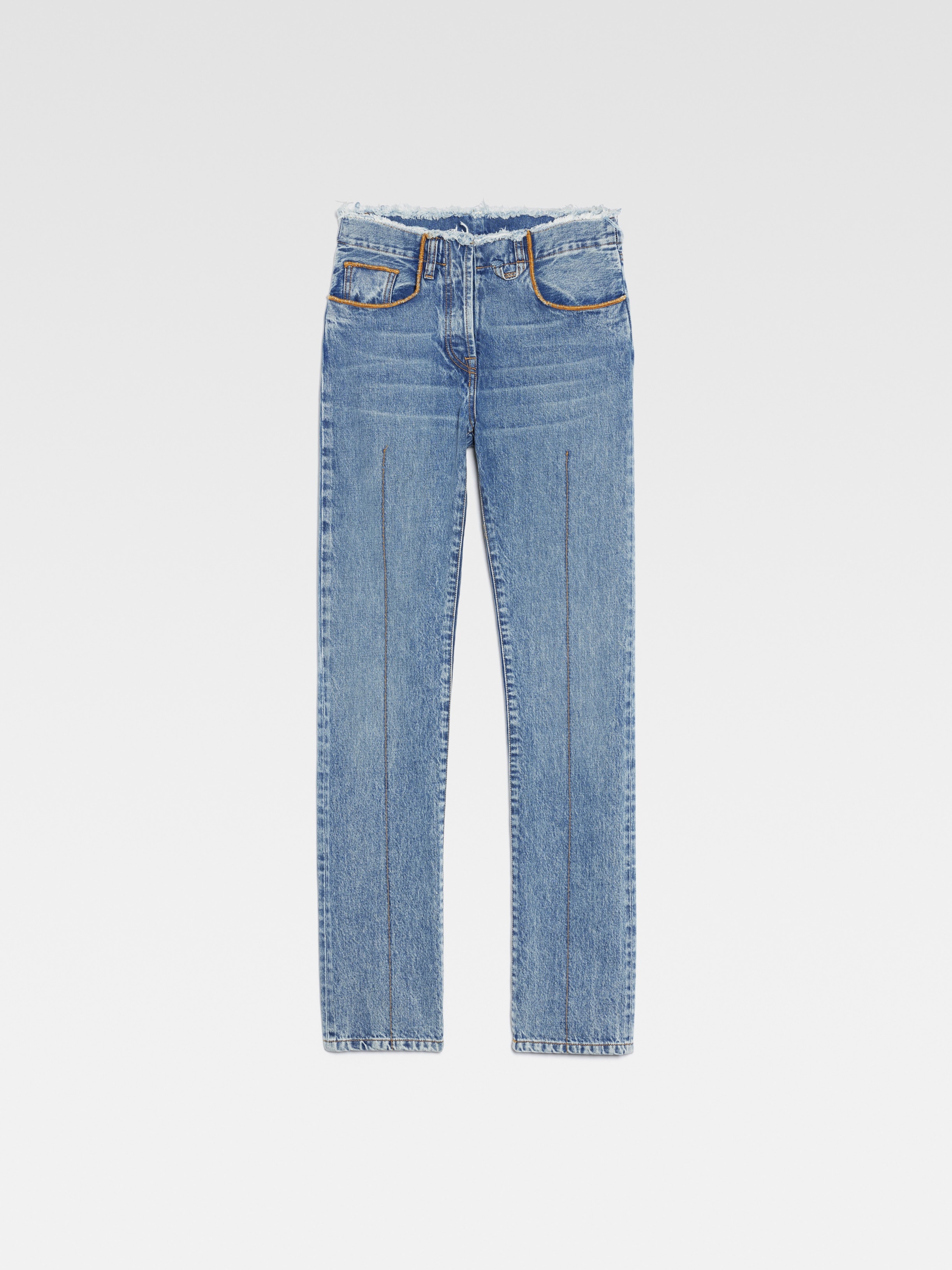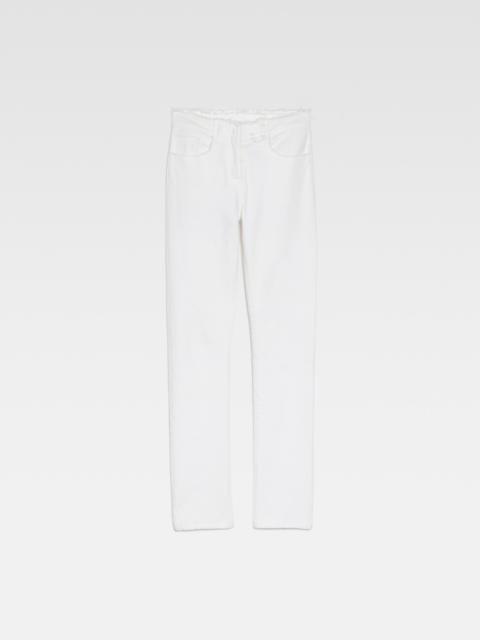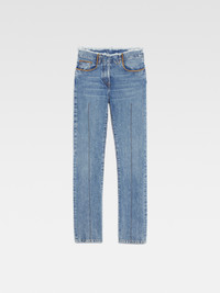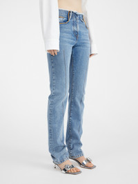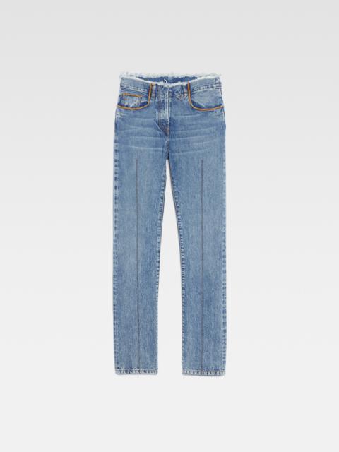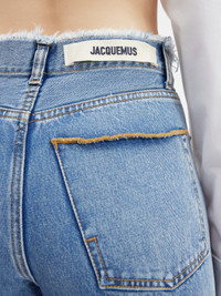 LE CHOUCHOU Frayed jeans - Low rise - Stone-wash organic denim - Long straight legs with central stitching - Contrast stitching - Frayed waistband - Hidden zip and button closure - Five pockets - “J” loop detail - Grosgrain logo ribbon on the back The model is 175 cm and wears a size 24. 100% Regenerative cotton Made in Italy Ref.233DE030-1015-31A