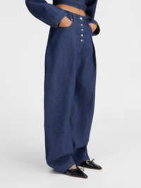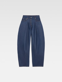 LES SCULPTURES Wide curved jeans - Mid rise - Raw indigo denim - Long curved leg - Four pockets with “J” shaped back pocket - Metal studs and rivets - Button fly - Pleated waist - Large denim patch above back pocket - Contrast stitching The model is 178 cm and wears a size 26 100% Cotone Made in Portugal Ref.241DE041-1513-38B