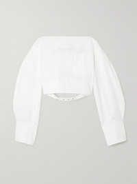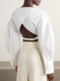 This 'Casaco' blouse is part of Jacquemus' Fall '24 'La Casa' collection, which is defined by exaggerated, sculptural shapes. Made from crisp cotton-poplin, it has a cropped design with a boat neckline and open back that secures with an adjustable silver-tone buckle.