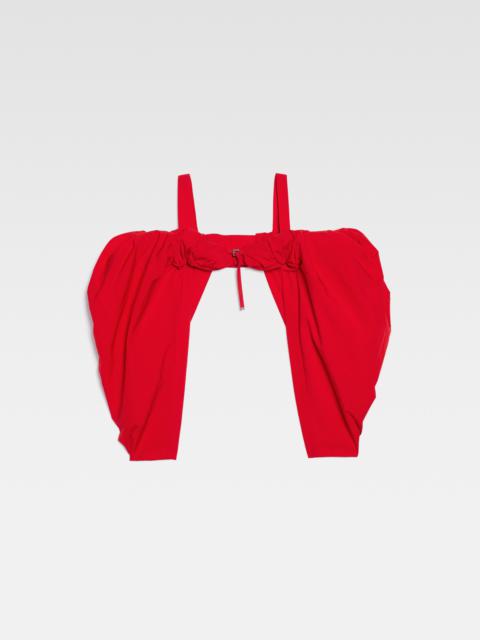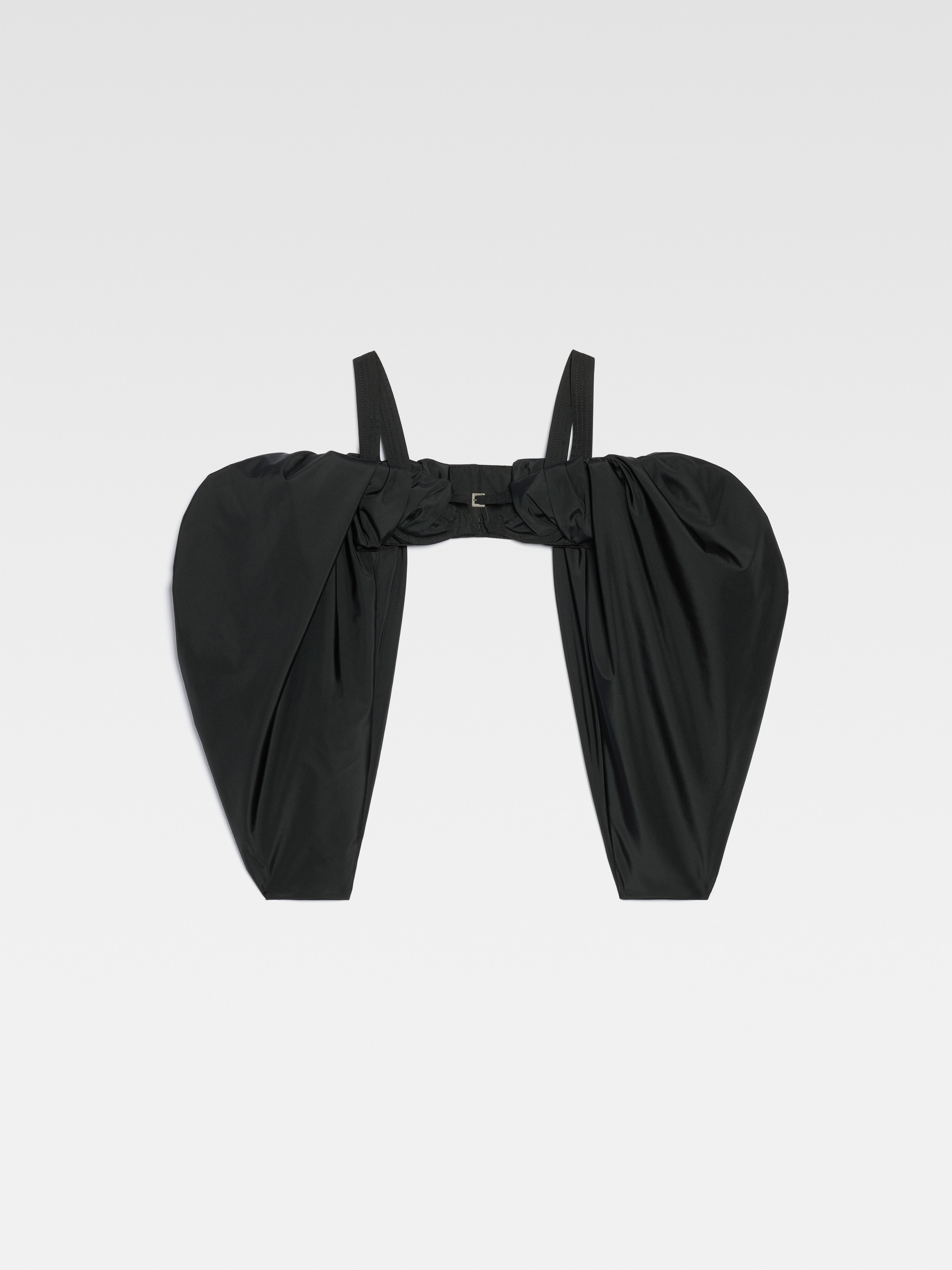 Le Chouchou Puffy sleeve bra - Draped, fitted shape - Puffed neckline with exposed shoulders - Ribbon straps - Metal buckle strap and lingerie hook closure - Long puffed sleeves - Lingerie hook fastener in the back - Cascading back The model is 179 cm and wears a size 34. 100% Polyester / Lining: 49% Cotton - 46% Acetate - 5% Elastane Made in Portugal Ref.233TO067-1472-990
