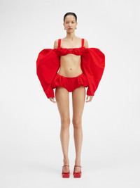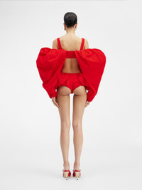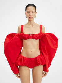 LE CHOUCHOU Puffy sleeve bra - Draped, fitted shape - Puffed neckline with exposed shoulders - Ribbon straps - Metal buckle strap and lingerie hook closure - Long puffed sleeves - Lingerie hook fastener in the back - Cascading back The model is 179 cm and wears a size 34. 100% Polyamide / Lining : 49% Cotton - 46% Acetate - 5% Elastane Made in France Ref.233TO067-1320-471