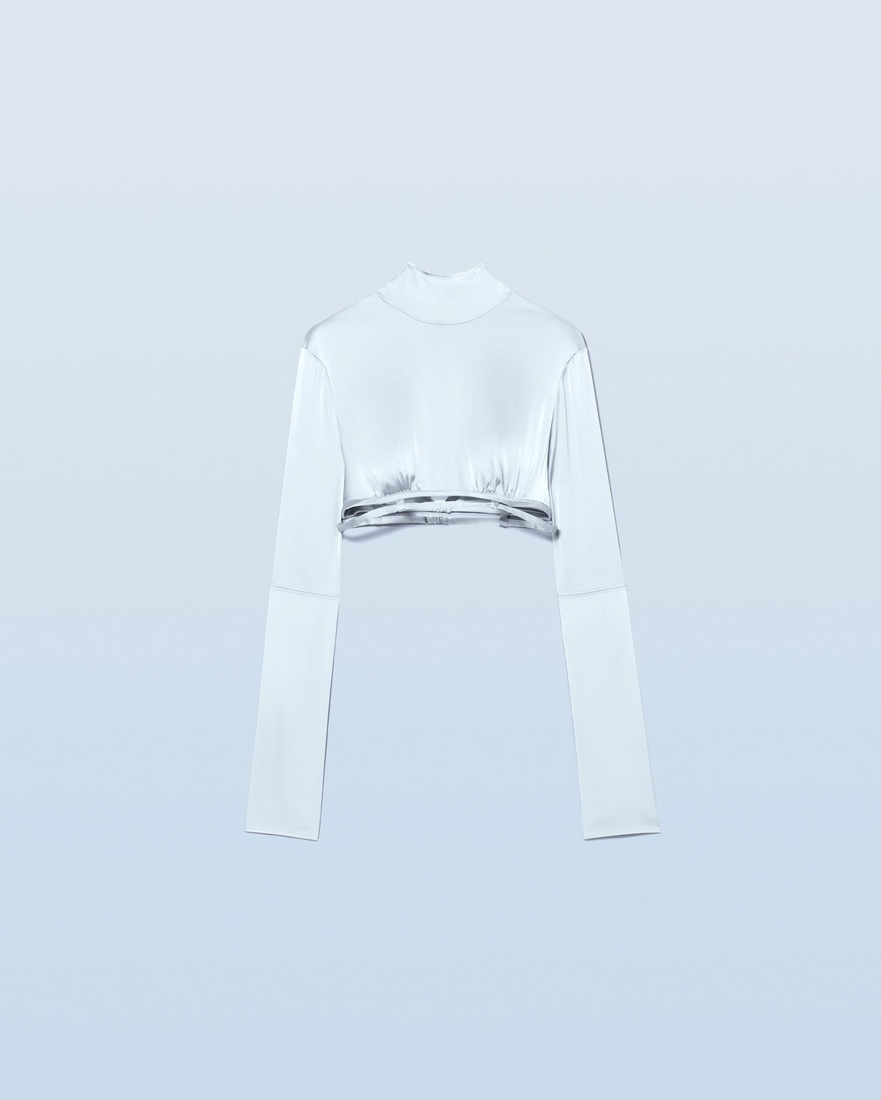 LE SPLASH Satin stand collar top - Micro length with long sleeves - Satin - Stand collar that ties at the back - Gathered below the bust - Adjustable strap under the chest - Slit elbows - Slit back This item is made of FSC® -certified fabric. FSC® certification guarantees that materials sourced from forests were managed with consideration for people, wildlife, and the environment. 96% Viscose - 4% Elastane Made in Portugal Ref.221TO005-1000-320