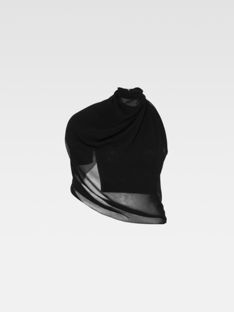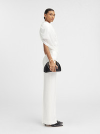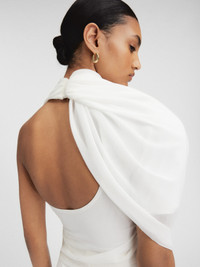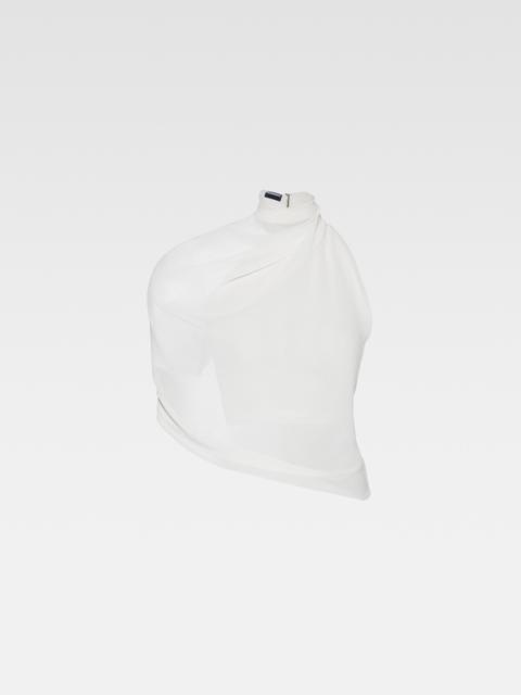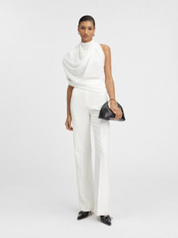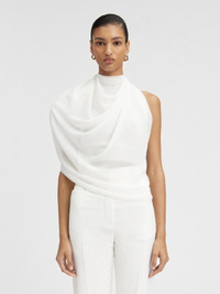 LES SCULPTURES Padded shoulder top. - Fitted, draped shape - Silk viscose blend - One rounded sleeve with shoulder pad - High neckline - Invisible side zip - Gold metal clip fastening in the back - Asymmetric hem The model is 178 cm and wears a size 34 100% Polyester - 97% Cotton - 3% Elastanne / Lining: 69% Polyamide - 31% Elastane Made in Romania Ref.241TO085-1555-100