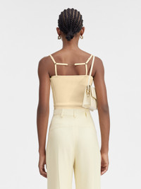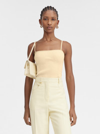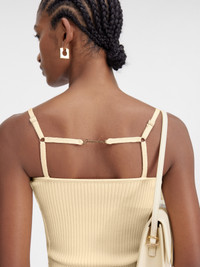 Les Classiques Lingerie tank top - Fitted shape - Rib knit - Adjustable elasticated straps - Gold metal charm logo in the back The model is 180 cm and wears a size XS 88% Viscose - 12% Polyester Made in Portugal Ref.241KN354-2355-115