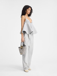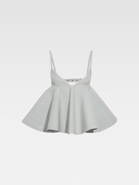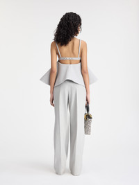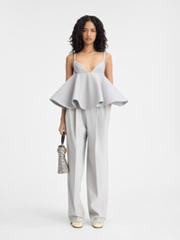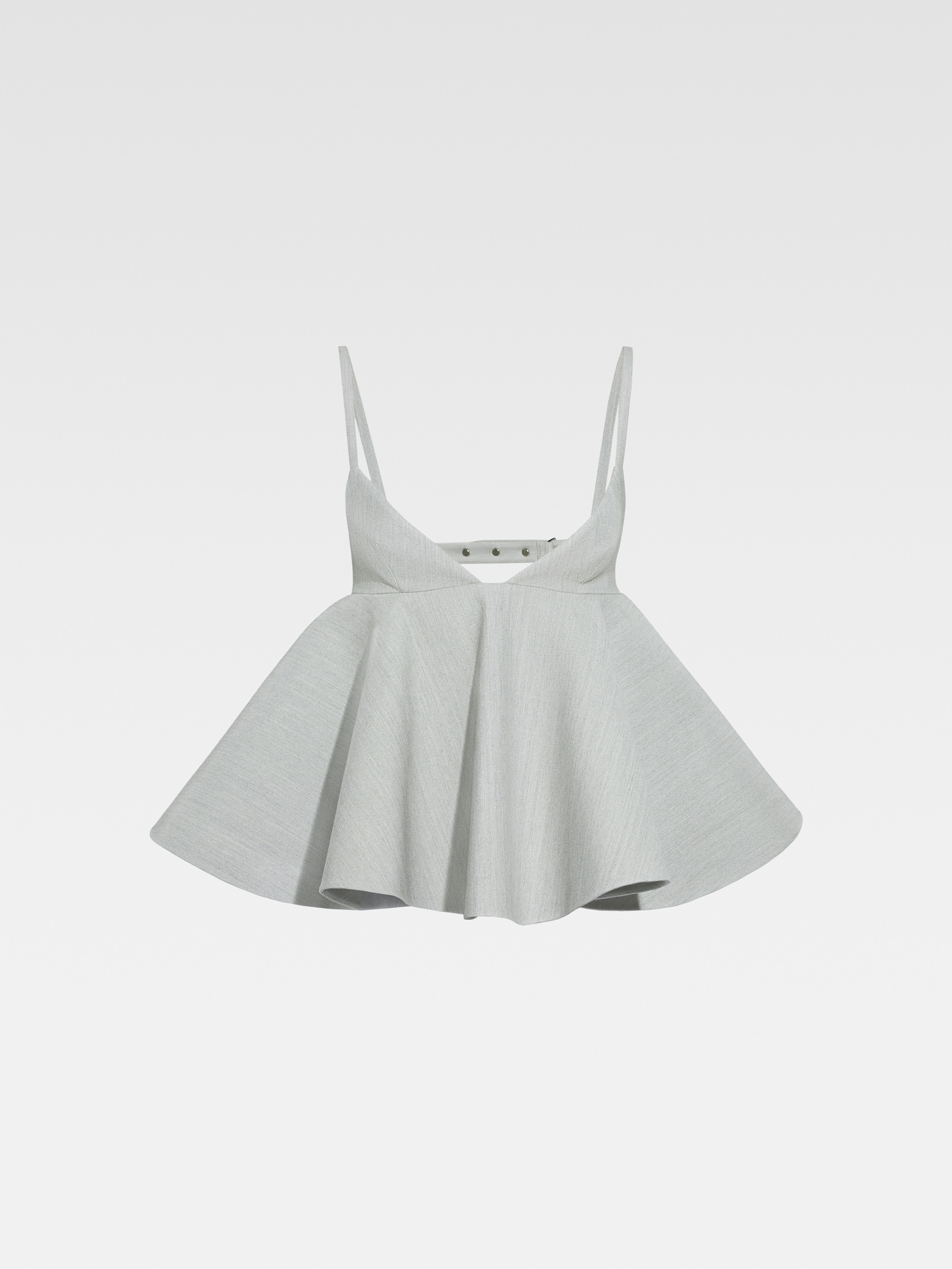 LA CASA Flounce top - Fitted shape with a flared peplum - Thin straps - Plunging triangle-bra neckline - Open back - Integrated strap in the back with metal buckle & studs - Invisible back zip The model is 178cm and wears a size 34 35% Polyester - 34% Cotton - 29% Virgin wool - 2% Elastane Made in Bulgaria Ref. 243TO104-1660-910