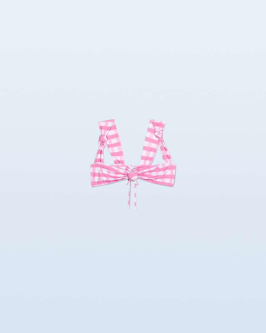 LE SPLASH Checked bikini top - Knotted neckline with wide straps - Watercolor checked print - Decorative knots - Elastic back ties - Zig-zag stitching details The model is 176 cm and wears a size XS 78% Recycled Polyester - 22% Elastane Made in Portugal Ref.221SW004-2026-4AM