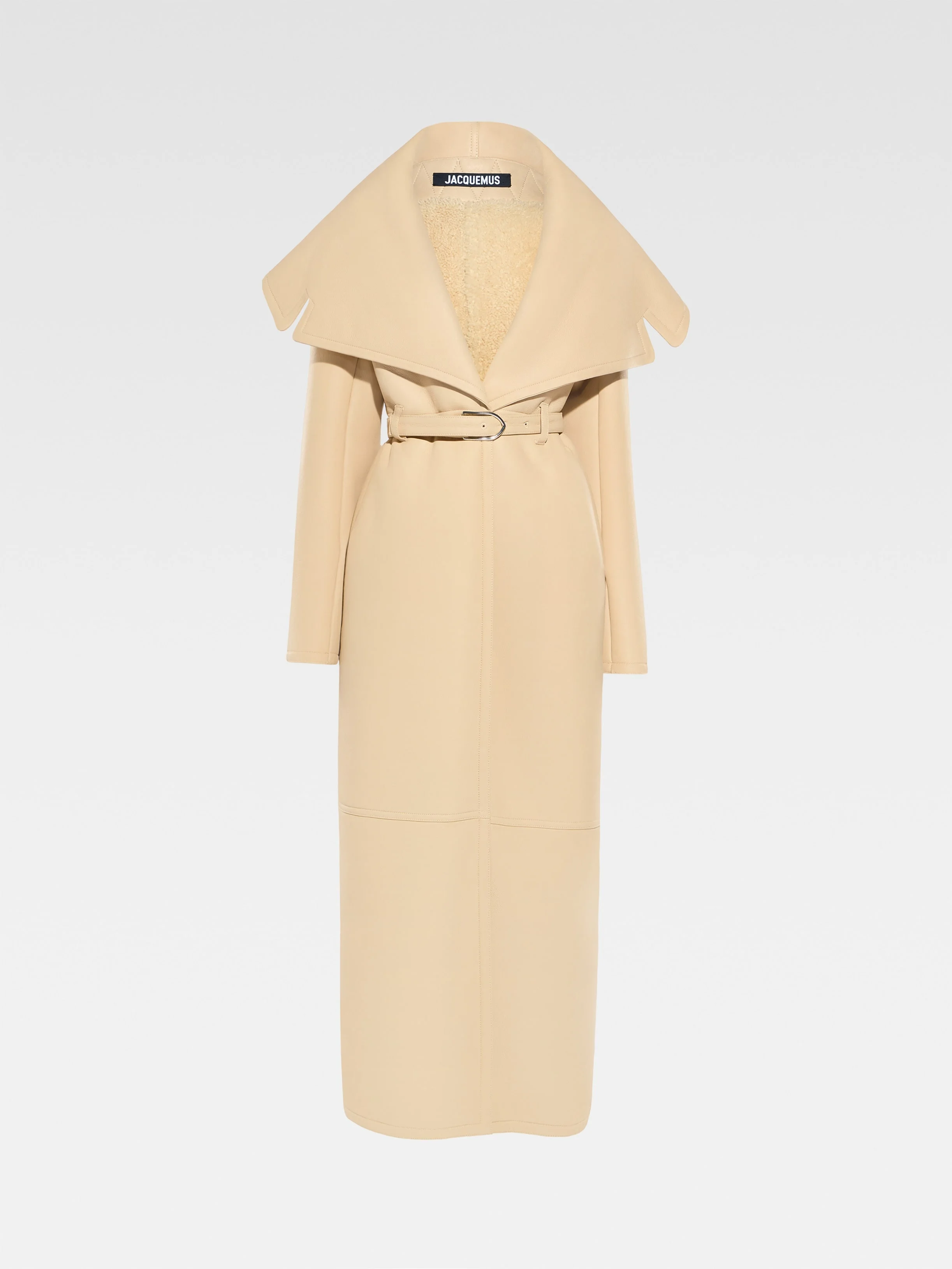 LA CASA Long shearling coat - Ankle-length - Straight fit with fitted waist - Soft leather exterior and shearing interior - Oversized, folded collar with notched edges - Topstitched details - Removable belt with pointed metal buckle - Belt loops - Side-seam pockets - Yoke - Silver metal hardware The model is 178cm and wears a size 34 100% Sheepskin Made in Turkey Ref. 243CO070-1664-205