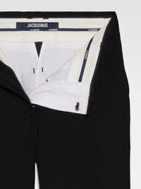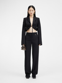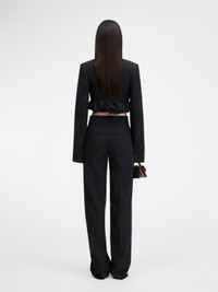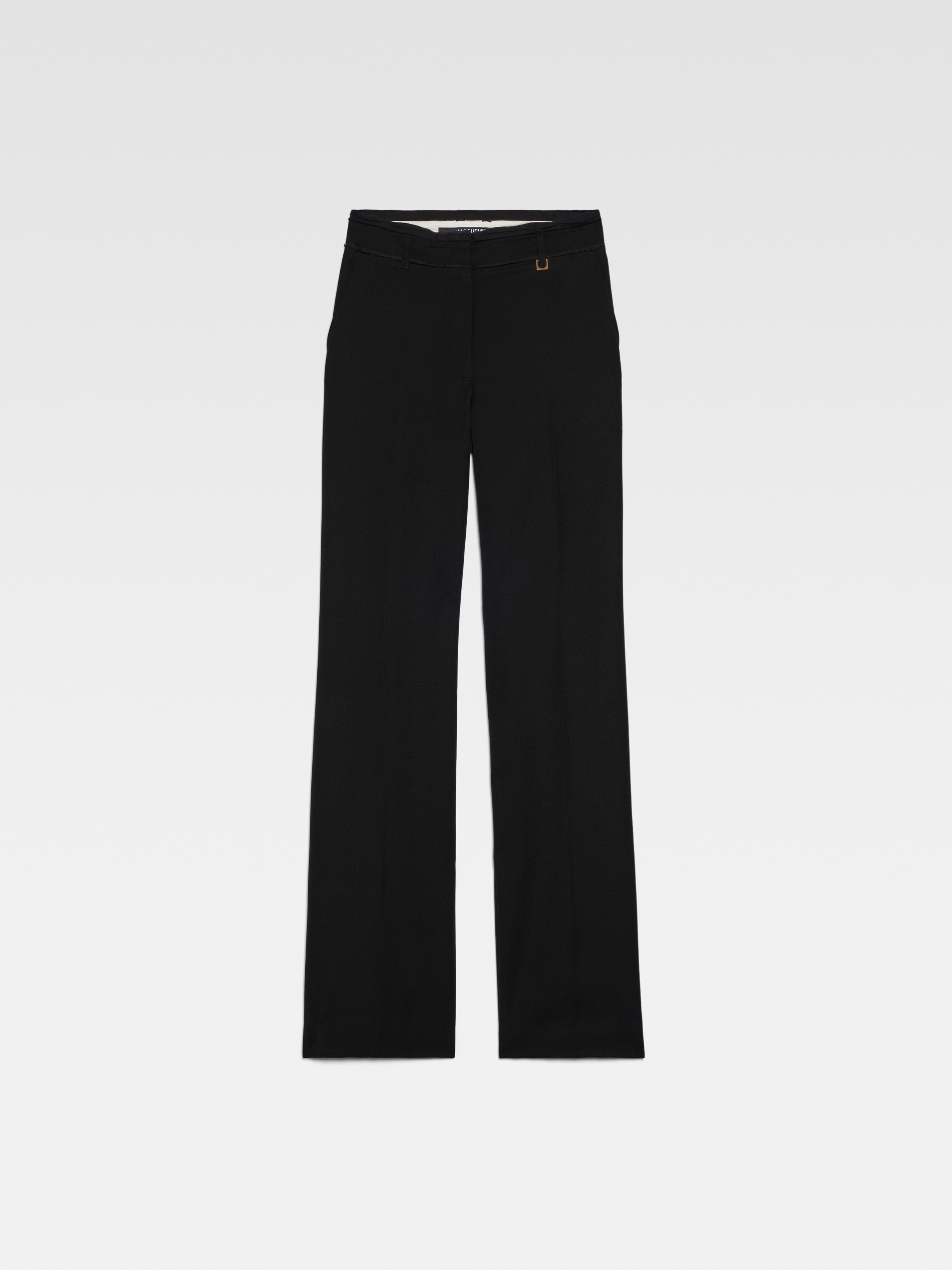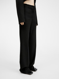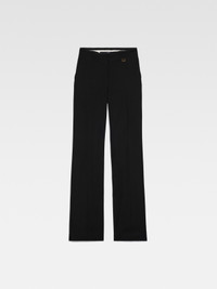 LE CHOUCHOU Soft tailored pants - High-waisted - Long, straight fit - Virgin wool - Hidden zip and button closure - Layered, piped finishings - Metal D-Ring on the belt loop - Side-seam pockets - Pressed creases - Back welt pockets - Back loop detail The model is 175 cm and wears a size 34. 100% Virgin wool / Lining : 97% Cotton - 3% Elastane Made in France Ref.233PA064-1333-990