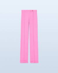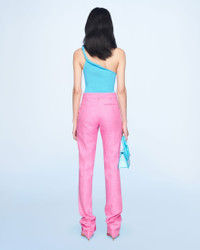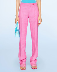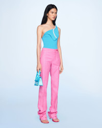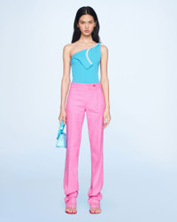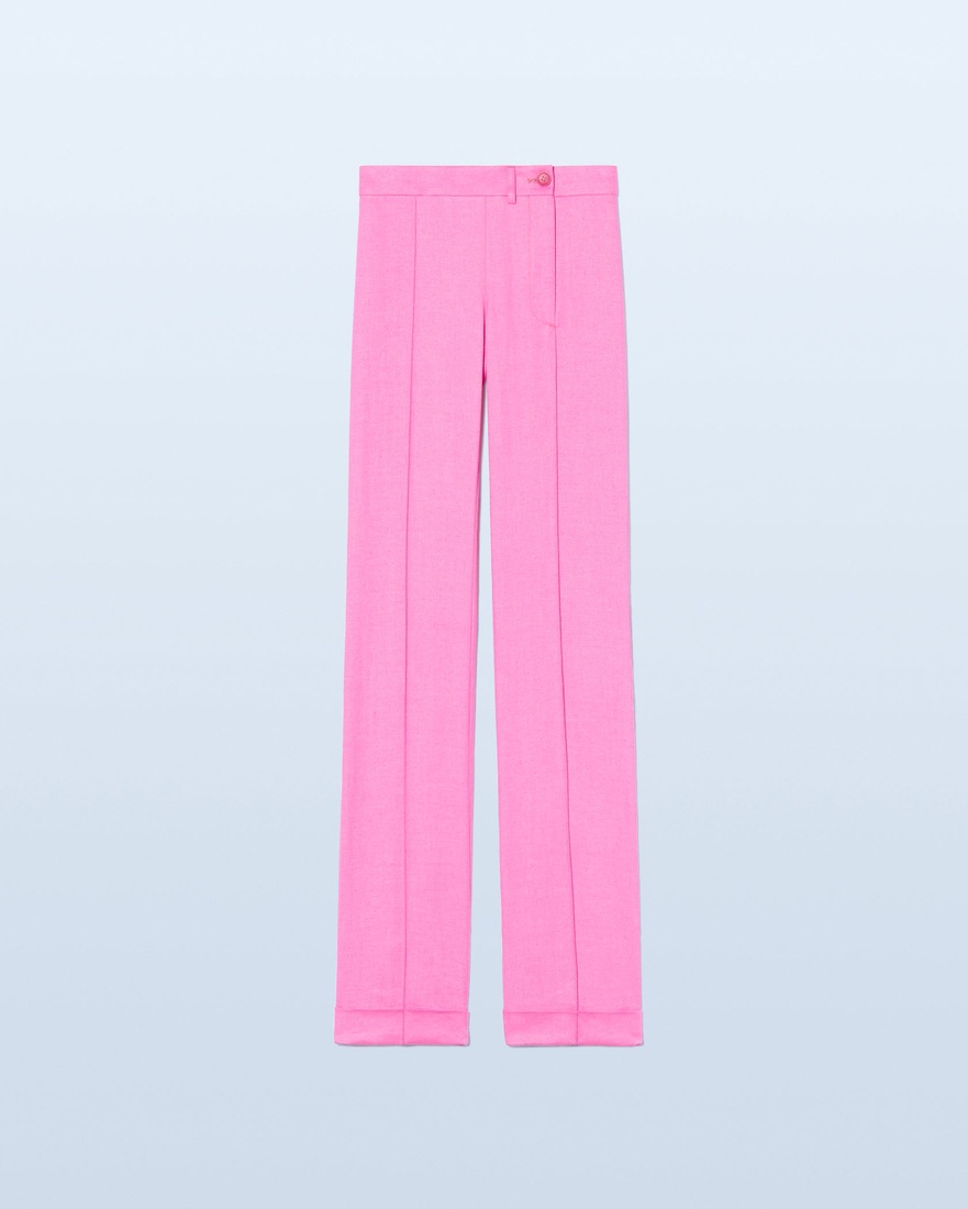 LE SPLASH Asymmetric suit pants - High-waisted - Straight leg with stitched pleat - Asymmetric hidden zip closure with hook and button - Jetted back pocket - Cuffed hem The model is 175 cm and wears a size 34 52% Polyamide/Nylon - 48% Linen Made in Romania Ref.221PA012-1007-430