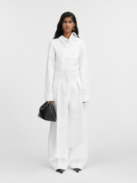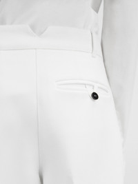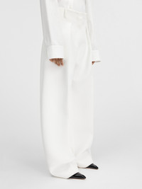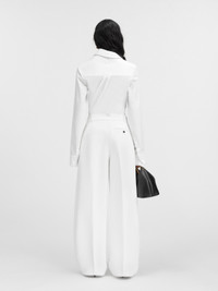LES SCULPTURES Curved pants - High-waisted - Wide, curved fit - Grown-on waist - Belt loops - Hidden zip and button closure - Pressed pleats - Side-seam pockets - Split waistband in the back - Back welt pocket with "J" button loop The model is 171 cm and wears a size 34 100% Polyester / Lining: 97% Cotton - 3% Elastane Made in Bulgaria Ref.241PA079-1526-100