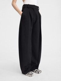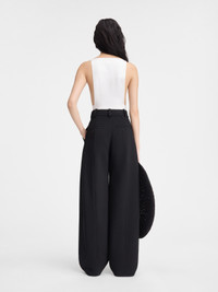 LA CASA Curved suit pants - Wide, high-rise cut - Thick stretch jersey - Belt loops with "J" loop on back - Hidden zip closure with hook and button - Slant pockets - Stitched and pressed box pleats - Curved legs - Back welt pockets The model is 178cm and wears a size 34 78% Viscose - 16% Polyamide - 6% Elastane Made in Bulgaria Ref. 243PA118-1667-990