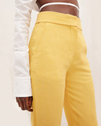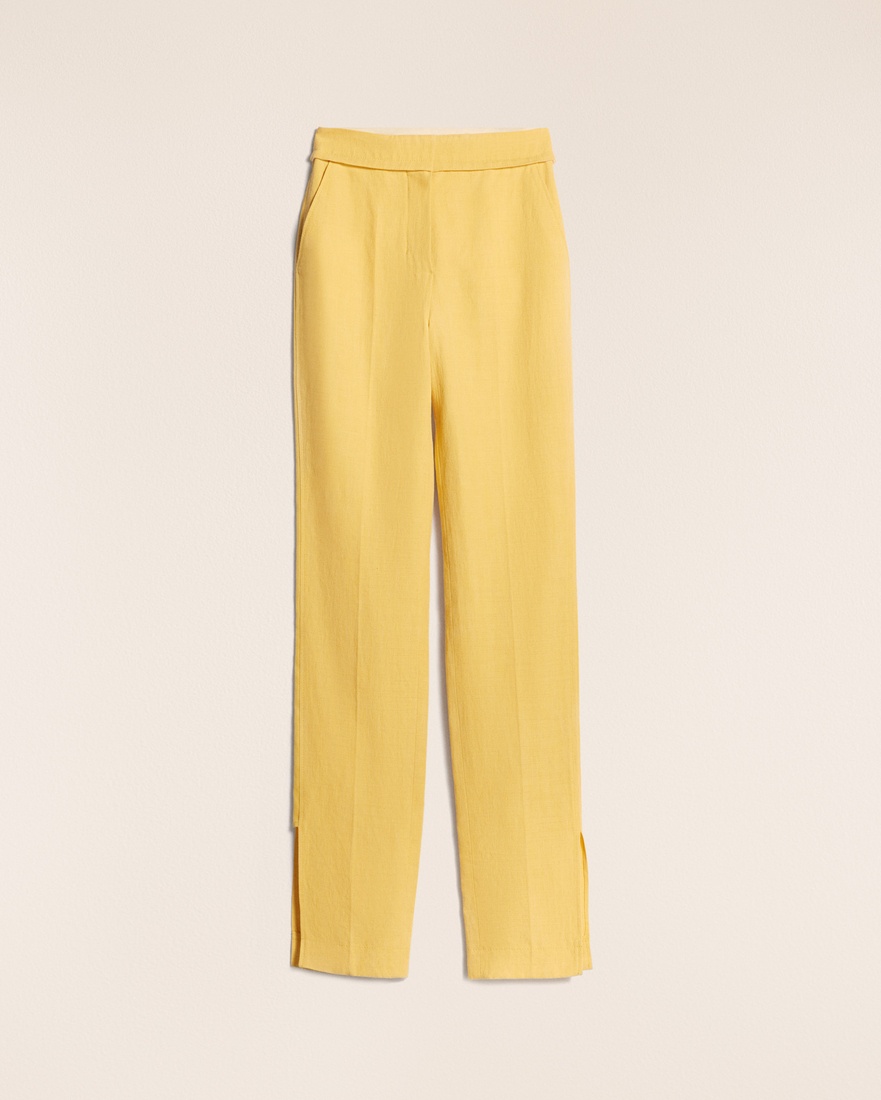 Le Raphia Slit pants - High-waisted - Linen canvas - Tapered legs with loose pleats - Side pockets - Ribbon insert along right side - Piped back pockets - Hidden zip closure with hook and button - Slit hem 60% Linen - 26% Viscose - 14% Polyester Made in Bulgaria Ref.231PA038-1069-250