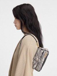 LA CASA Mini puffed flap bag - Zebra jacquard soft padded bag - Double shoulder straps to carry on the shoulder or across the chest - Magnetic flap tab closure - Engraved lobster clip - Back patch pocket - Interior pocket - Gold-plated logo and hardware - Fully lined in cotton - Height: 11cm - Length: 20.5cm 100% Lambskin / Lining: 30% Polyamide - 30% Viscose - 25% Polyester - 15% Linen Made in Italy Ref. 233BA388-3217-9DZ