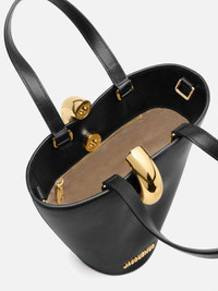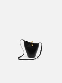 LA CASA Asymmetric mini bucket bag - Smooth leather bucket bag - Removable cross-body strap - Ring clasp in gold-plated metal - Double top-handles - Interior zipped pocket - Topstitched details - Gold-plated logo and hardware - Fully lined in cotton - Dyed edges - Height: 24cm - Length: 24cm - Width: 10cm 100% Cow leather / Lining: 100% Cotton Made in Italy Ref. BAW00389AC01C01990