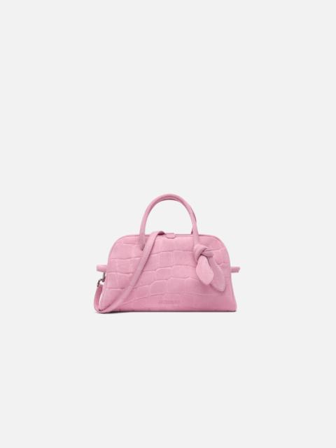 Small soft bowling bag - Crocodile embossed suede bowling bag - Two-way zip closure - Inside pocket - Detachable and adjustable shoulder strap - Bow detail - Dimensions: 26 cm x 16 cm x 11 cm 100% Calfskin Made in Italy Ref.251BA416-3243-410