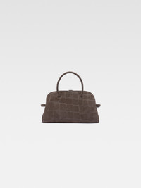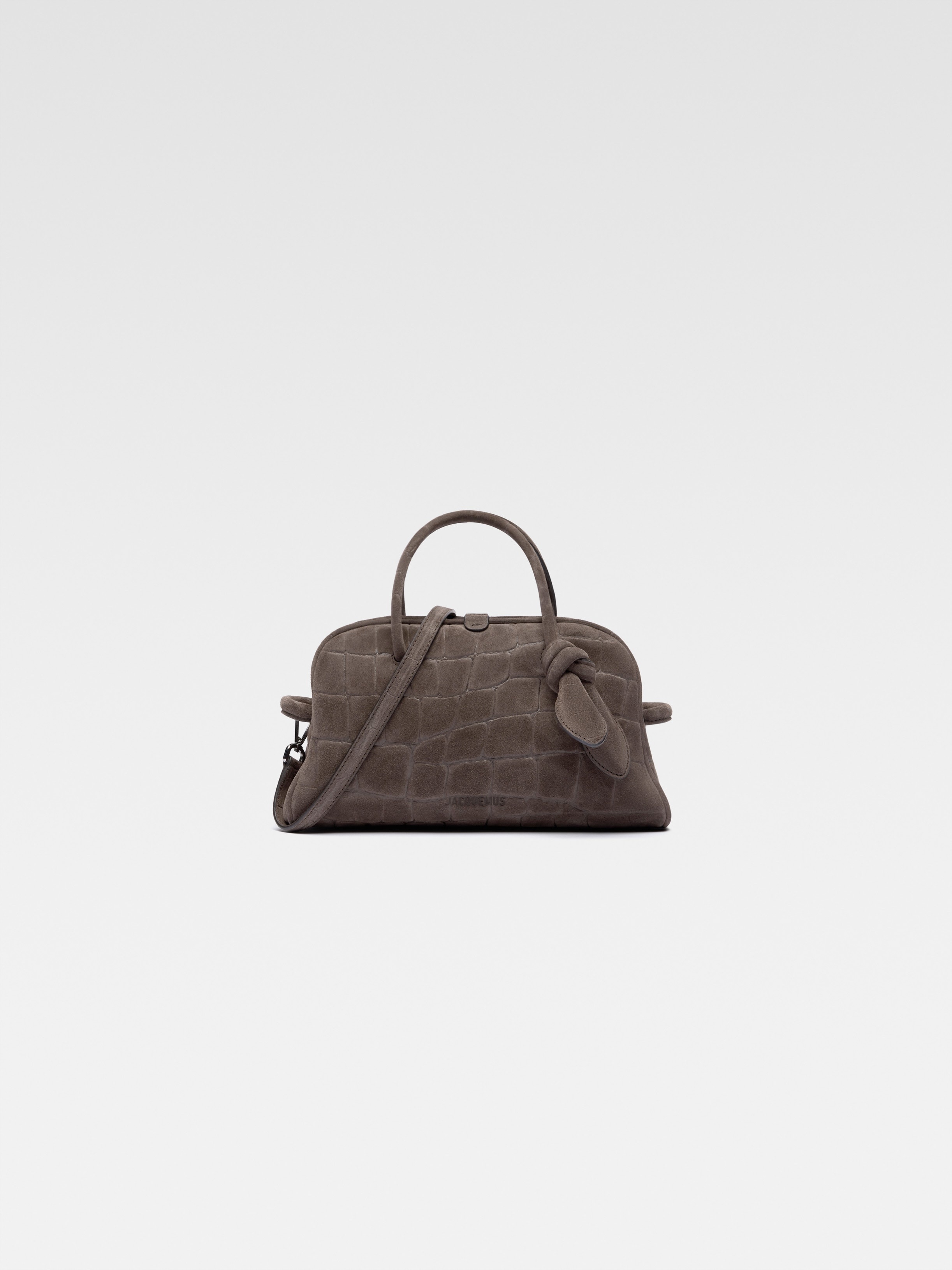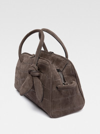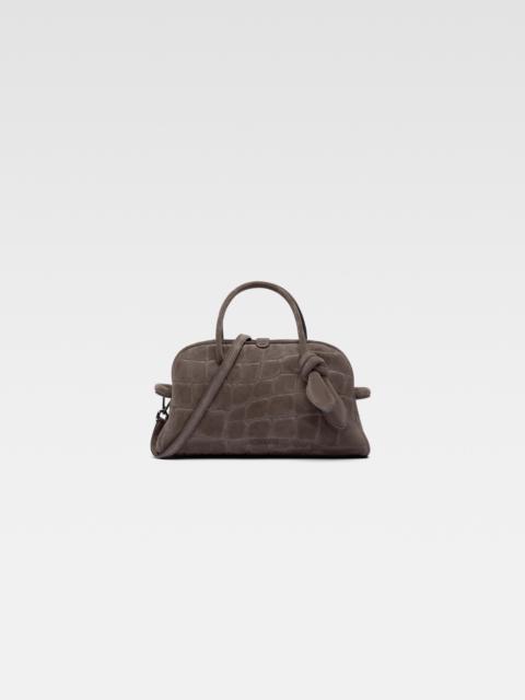Small soft bowling bag - Crocodile embossed suede bowling bag - Two-way zip closure - Inside pocket - Detachable and adjustable shoulder strap - Bow detail - Dimensions: 26 cm x 16 cm x 11 cm 100% Calfskin Made in Italy Ref.251BA416-3243-880