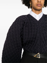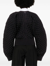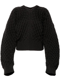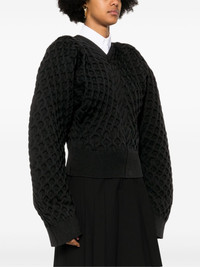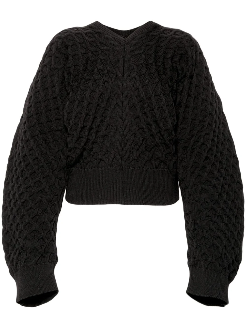 Le Sweater Boule Torsade jumper Highlights - Black - Chunky honeycomb knit - Ribbed trim - Panel detailing - V-neck - Shoulder pads - Long sleeves - Unlined - Straight hem Made in Italy Composition Polyamide 100% SIZE & FIT Model measurements Height 5 ft 10 in(1.77 m) Bust/Chest 33.07 in(84 cm) Hips 37 in(94 cm) Waist 24.8 in(63 cm) FittingInformation Designed for a slim fit that sits just away from the body offering a close yet comfortable fit The ribbed hem offers a close, comfortable fit Made with a heavyweight knit, this piece offers some stretch This piece fits true to size – take your usual size