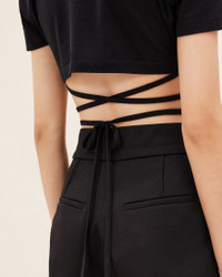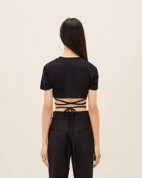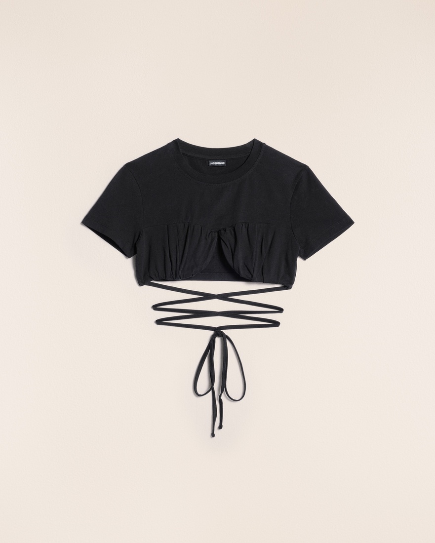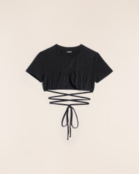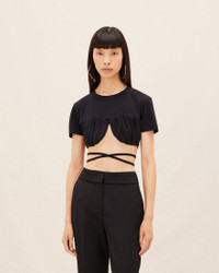 LE SPLASH Gathered bra t-shirt - Fitted, cropped shape - Ribbed crewneck - Gathered chest yoke with integrated underwire - Self-fabric cords wrap around the waist The model is 176 cm and wears a size XS 100% Organic Cotton Made in Portugal Ref.211JS001-2160-990