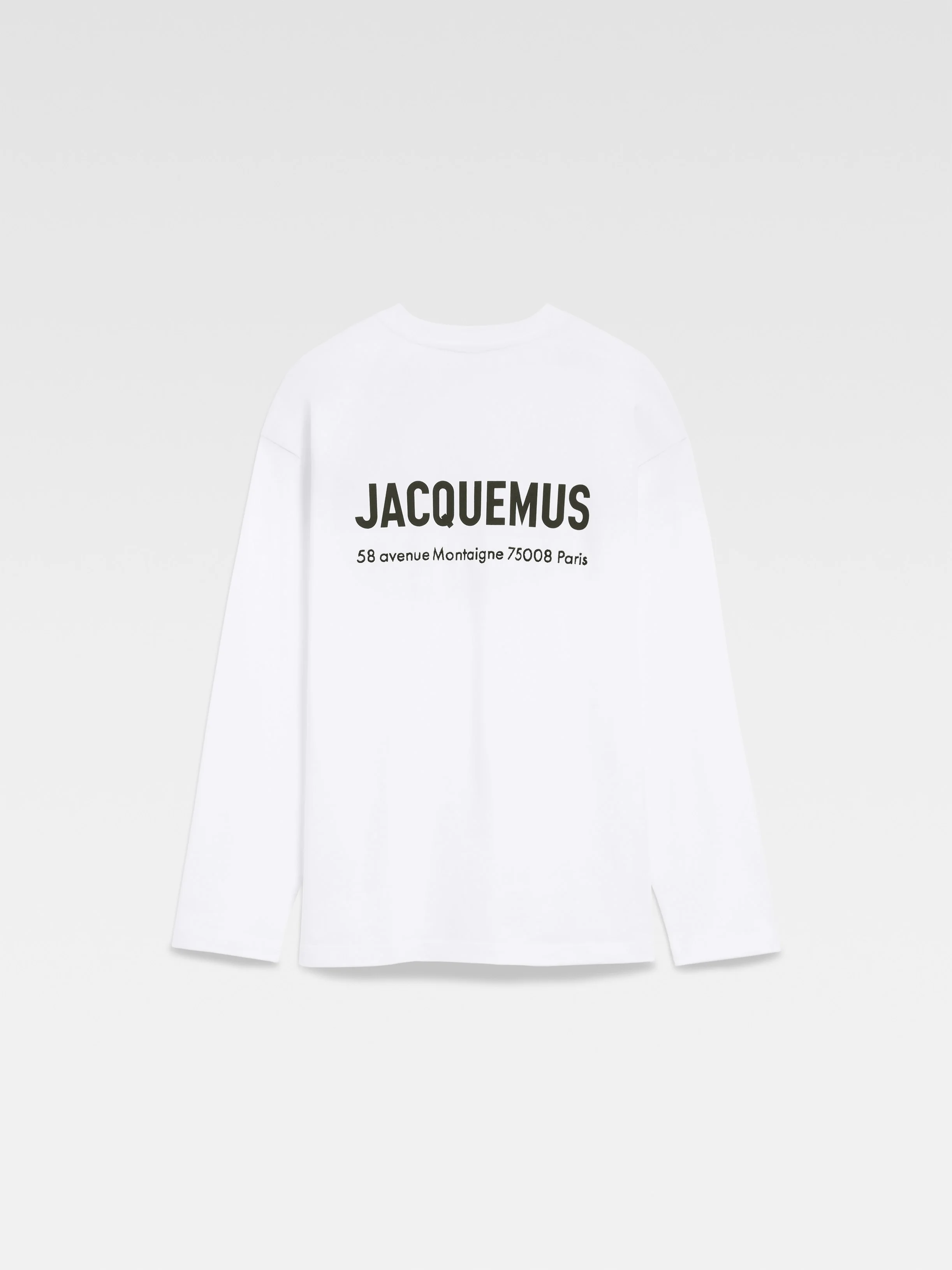 Long sleeve t-shirt with printed address and logo - Regular fit - Ribbed crewneck - Printed logo on chest - Printed address of the Jacquemus boutique on back Sold exclusively online and in the boutique located at 58 avenue Montaigne, 75008 Paris. 100% Cotton Made in Portugal Ref. 245JS150-2099-1HZ