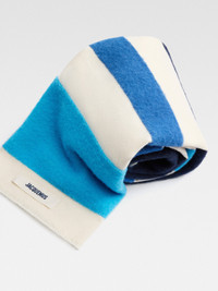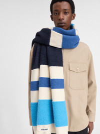LA CASA Wide tricolour scarf - Alpaca wool blend long scarf - Brushed tricolour stripe knit - Embroidered grosgrain logo - Width: 65cm - Length: 200cm - 1cm fringe on each end 45% Alpaca wool - 44% Cotton - 11% Polyamide Made in Italy Ref. 246AC683-5206-030
