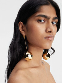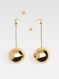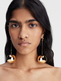 LA CASA Giant circle dangle earrings - Plated brass with a smooth finish - Long suspended bar - Hollow 3-D ball charms - Engraved circle and square push-backs - 35mm diameter - Weight: 18.7g 100% Brass Made in Italy Ref. 241JW719-5845-280