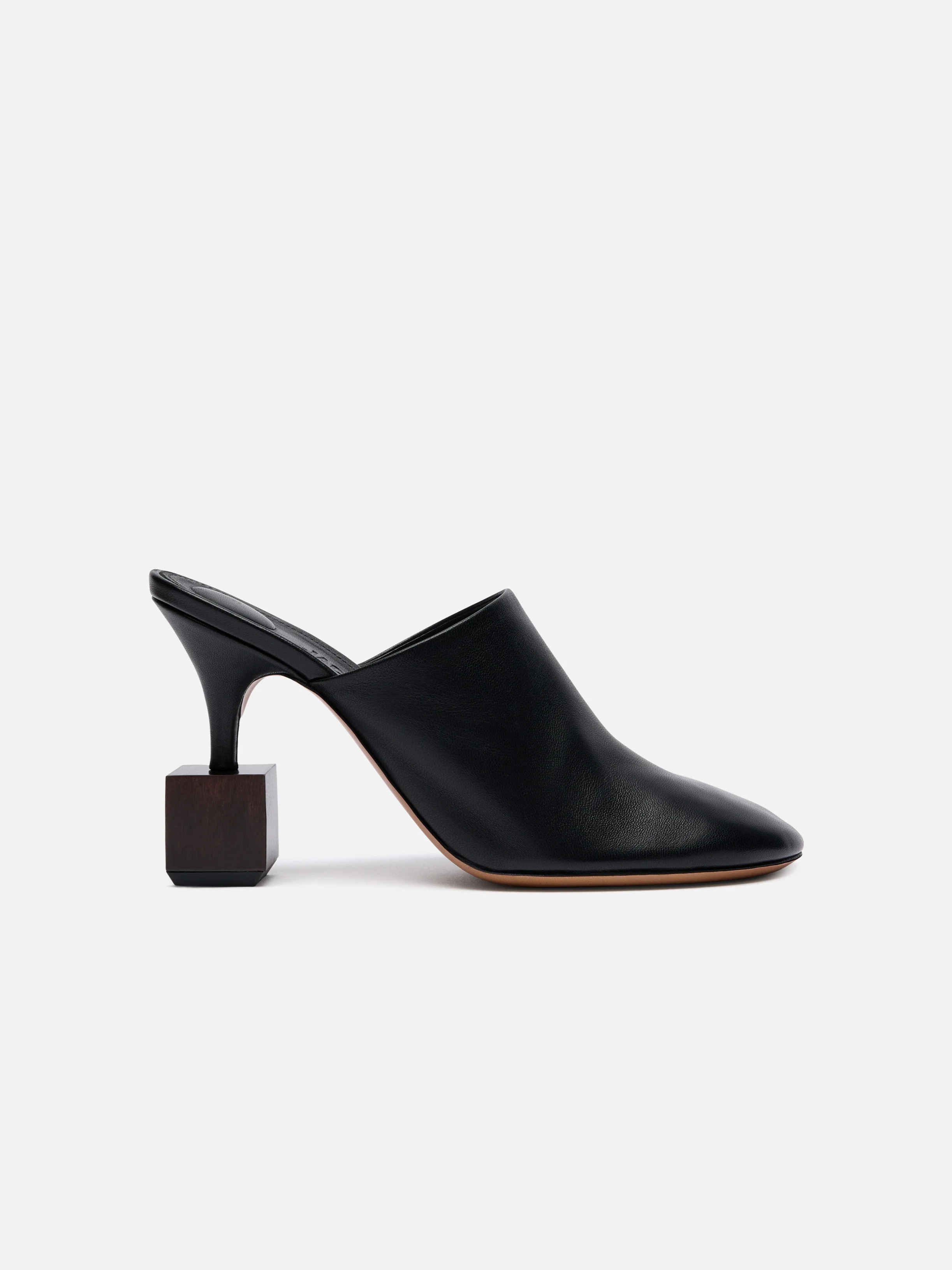 LA CROISIERE Geometric-heel mules - Smooth leather mules - Round toe - Embossed logo on insole - Lambskin insole and lining with circle and square cushions - Lambskin-covered heel with wooden circle and square heel charm - Leather sole - Heel height: 9cm To protect the leather soles of all shoes, a transparent protective film has been applied to each sole. To remove it, please follow the direction of the arrow in order not to damage the leather sole. 100% Lambskin / Sole: 100% Cowskin Made in Italy Ref. 251FO161-3073-990
