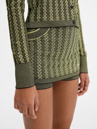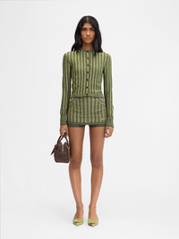 LA CROISIERE Culotte mini skirt - High-waisted - Braided motif stretch viscose - Contrast ribbed waist, details and hem - Apron front panel - Trompe l’oeil pocket - Embroidered logo - Visible shorts in the back The model is 171cm and wears a size 34 93% Viscose - 4% Polyester - 3% Elastane Made in Bulgaria Ref. 251KN606-2433-090