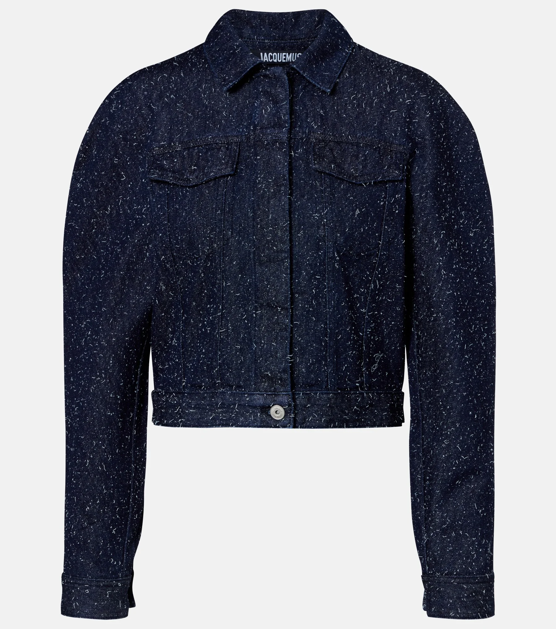 Jacquemus brings a characterful vision of French fashion to the design of every new collection. The Ovalo de-Nimes denim jacket is a cropped design with all-over embroidered accents. Product Details - Material: 97% cotton, 3% polyamide - Care instructions: hand wash - Made in Italy - Color: blue - Designer color name: Navy - Lining: 65% polyester, 35% cotton - Collar: classic (Straight point) - Closure: buttoned front - Pockets: flap chest pockets - Cuff: one button - Adjustable tabs at the waist - Item number: P01126332