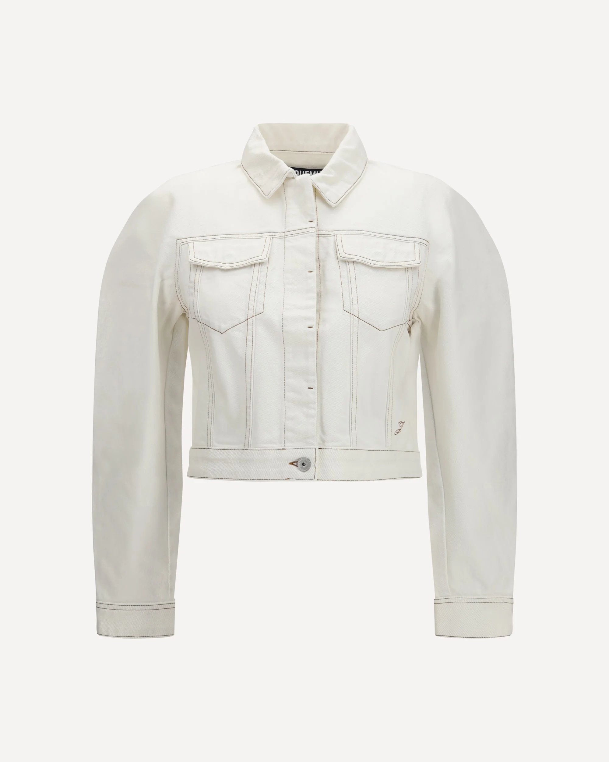 The Ovalo Jacket in denim by Jacquemus is a denim jacket with a curved design, featuring a straight fit that ensures comfort and structure. Made from ecru denim with tone-on-tone stitching, it features a pointed collar, back yoke, and patch chest pockets that reinterpret classic workwear in a modern way. The rounded sleeves define the garment’s distinctive silhouette, while the embroidered “J” on the side adds an iconic detail. The model is completed with buttoned cuffs, adjustable tabs at the hem, and engraved metal buttons. DETAILS - Sku: JAW00112AD00040_11C - Season: SS26 - Fit: Regular - Composition: GENERAL 100% Cotton - MADE IN ITALY