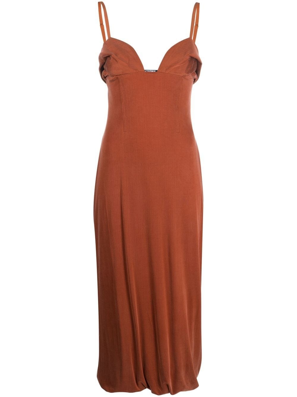 Praia bustier-neck midi dress Designed in a rich terracotta brown, Jacquemus' Praia midi dress falls into a fluid jersey material and is elevated by its bustier-style neckline for a structured silhouette. Imported Composition Outer: Cupro 93%, Spandex/Elastane 7% Lining: Polyamide 82%, Spandex/Elastane 18% SIZE & FIT Model measurements Height 5 ft 10 in(1.79 m) Bust/Chest 31.1 in(79 cm) Hips 35 in(89 cm) Waist 24 in(61 cm) FittingInformation This piece fits true to size. We recommend you get your regular size Cut for a slim fit Made with a mid-weight stretch fabric