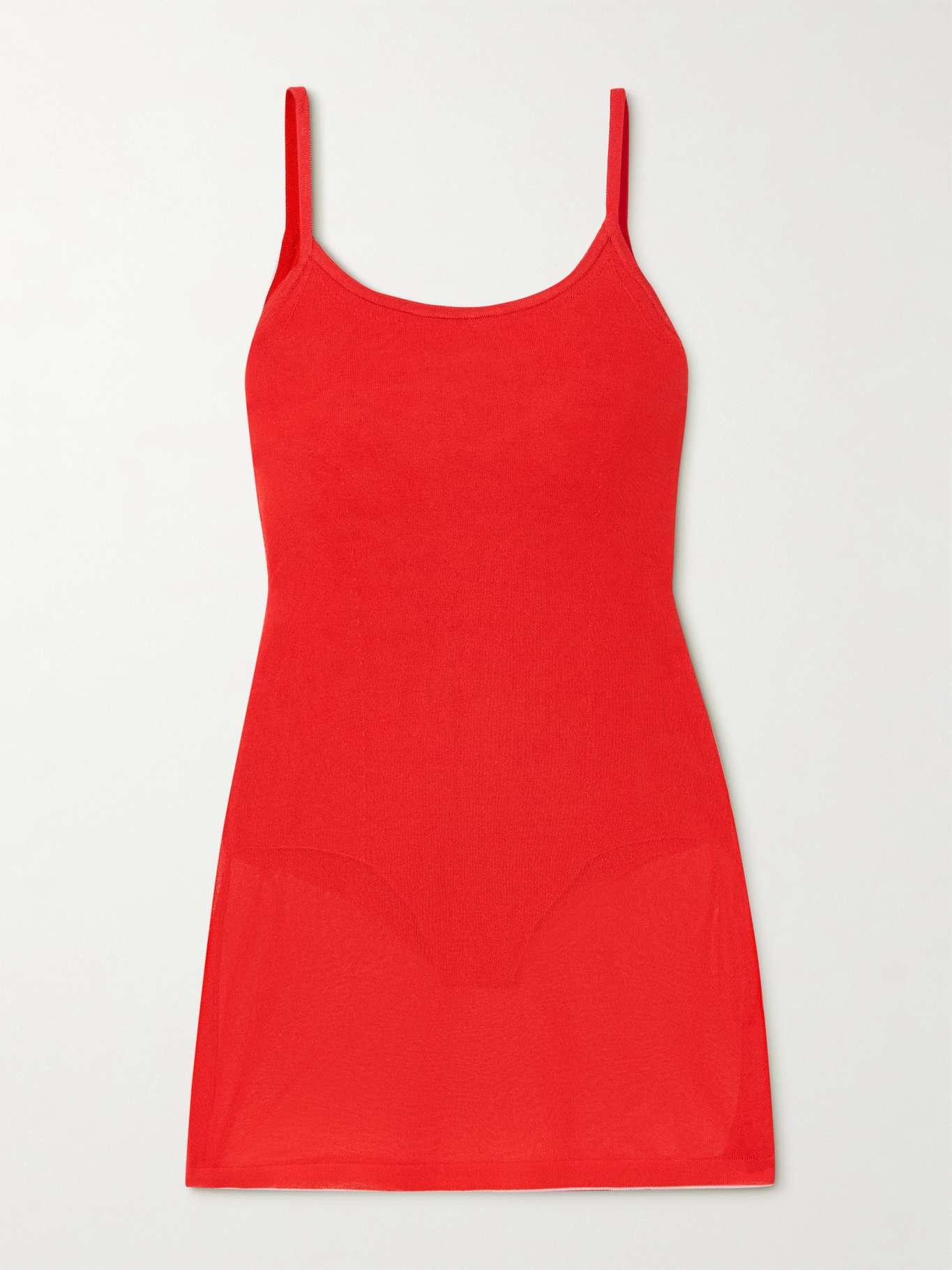 EDITORS'NOTES Jacquemus’ ‘Roupao’ dress is lined with a tonal bodysuit underneath, keeping it sheer at the mini hem. It's made from stretch-mesh and has a low, scoop neckline. Style yours with plenty of gold jewelry. SIZE & FIT - Fits true to size, take your normal size - Designed for a close fit - Lightweight knit - Model is wearing a FR 36 DETAILS & CARE - Red stretch-mesh - Slips on - 79% viscose, 19% polyamide, 2% elastane