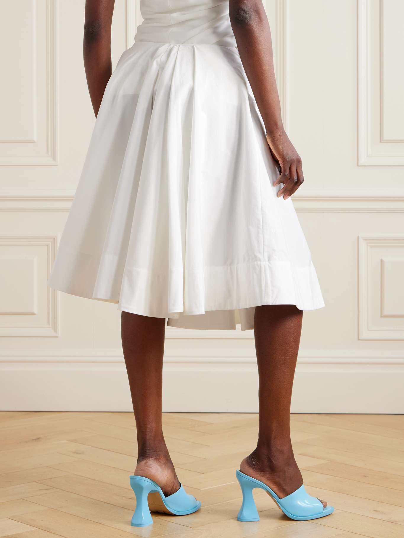 EDITORS'NOTES Jacquemus’ ‘Salon’ skirt is made from crisp cotton-poplin that’s asymmetrically folded at the waist to create soft pleats. It has a floaty shape with a reinforced hem and hits just at the knee. You can style it with a collared shirt, tonal tank or chunky sweater. SIZE & FIT Model measurements: - Fits true to size, take your normal size - Falls below the knee, designed to be worn just below the natural waist - Lightweight, non-stretchy fabric - Model is 177cm/ 5'10" and is wearing a FR 34 - Bust: 81cm/ 32" - Waist: 62cm/ 24.5" - Hip: 89cm/ 35 DETAILS & CARE - White cotton-poplin - Concealed button and zip fastening at back - 100% cotton