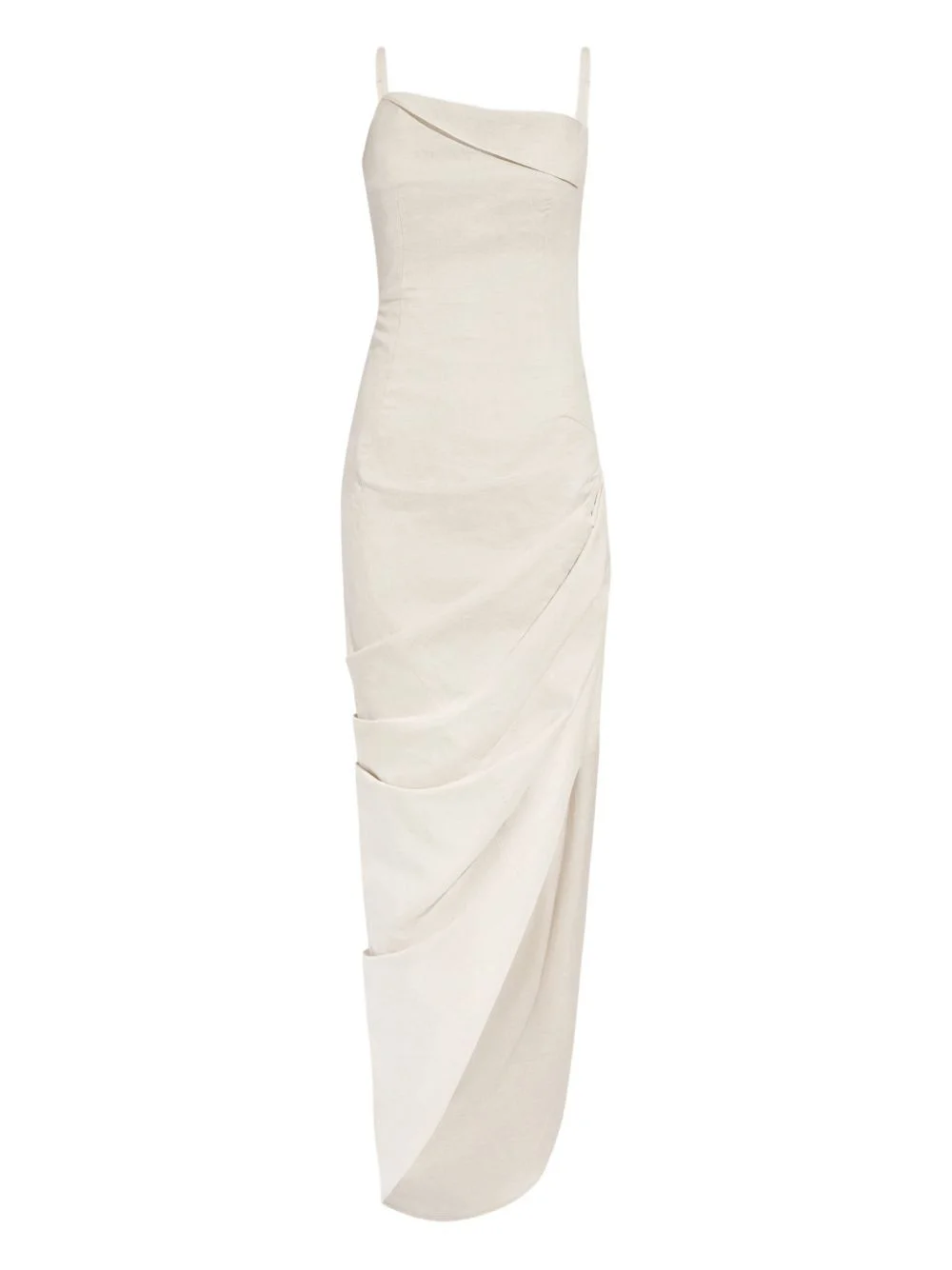 Saudade draped open-back maxi dress Highlights - Beige - Draped detailing - Open back - Spaghetti straps - Asymmetrical hem - Side slit Imported Composition Viscose 88%, Polyamide 12% Washing instructions Read Manufacturer Guidelines