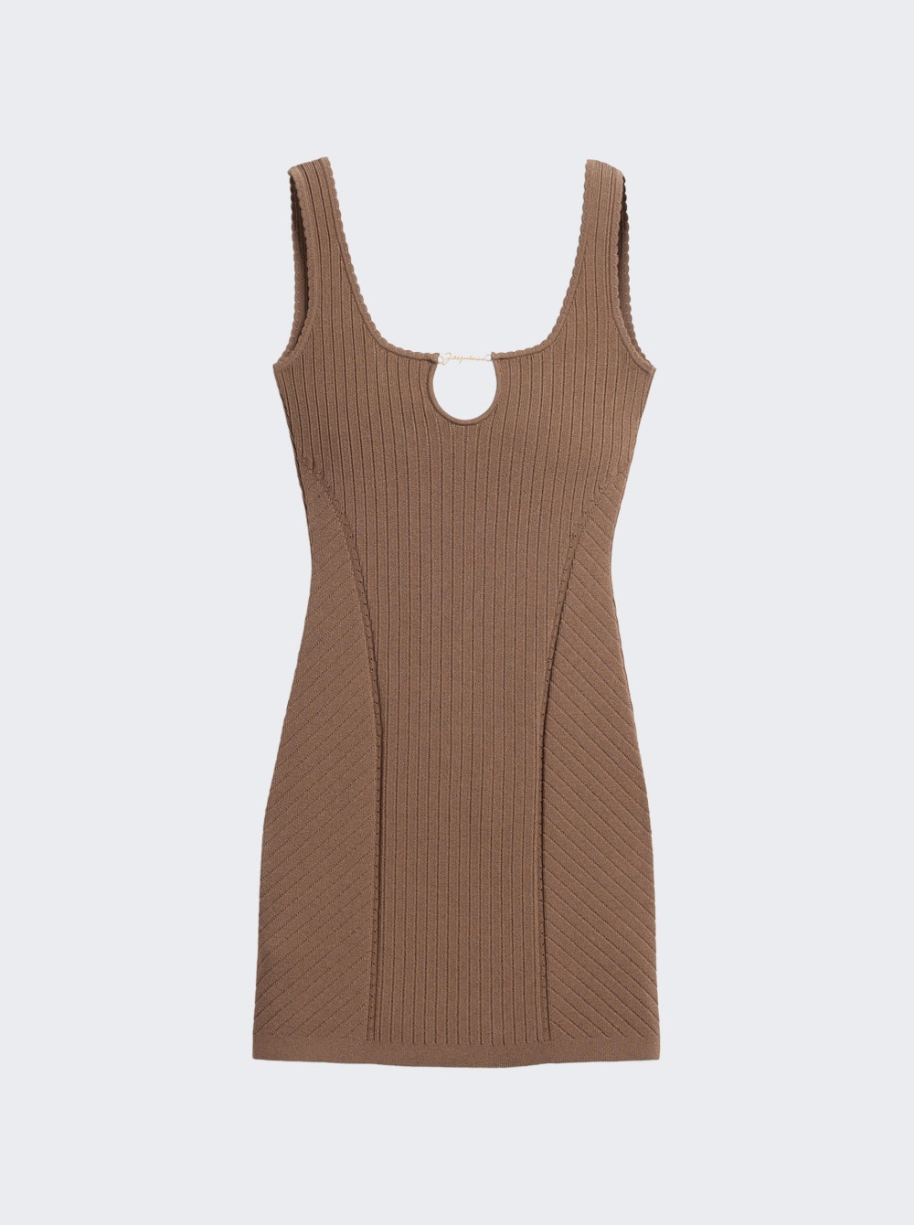Details - Fitted silhouette - Scalloped neckline - Mini length - Gold metal charm logo - Open back - Care according to label - Material: 88% Viscose, 12% Polyester - Model is 5'9"/175cm and is wearing a size S Brand Style: 241KN355-2355 Designer/Brand: JACQUEMUS