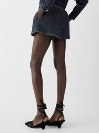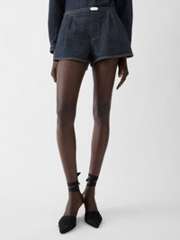 Denim pleated shorts - Mid rise - Stretch indigo denim - Embroidered patch on the front waistband - Stitched pleats - Faux fly - Embroidered “J” on the leg - Integrated tied belt in the back - Elasticated waistband in the back The model is 178cm and wears a size 34 93% Cotton - 6% Cashmere - 1% Elastane / Lining: 96% Cotton - 4% Elastane Made in Romania Ref. SOW00612AD00041390
