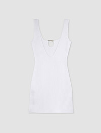 The fitted Jacquemus Sierra mini robe with ribbed knit, featuring a wavy neckline and armholes. Features a gold metal Jacquemus charm on the drop opening and an exposed back. Product Reference Code: 241KN355-2355 110
