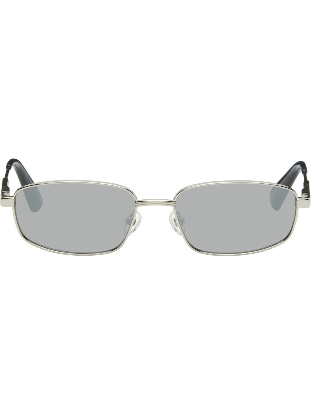 Rectangular stainless steel-frame sunglasses. · Mirrored gray lenses · 100% UVA/UVB protection, category 3 · Adjustable rubber nose pads · Logo etched at temples · Navy acetate temple tips · Includes pouch · Size: 56.17 140 Supplier color: Silver Stainless steel, acetate. Made in Japan 252553F005004