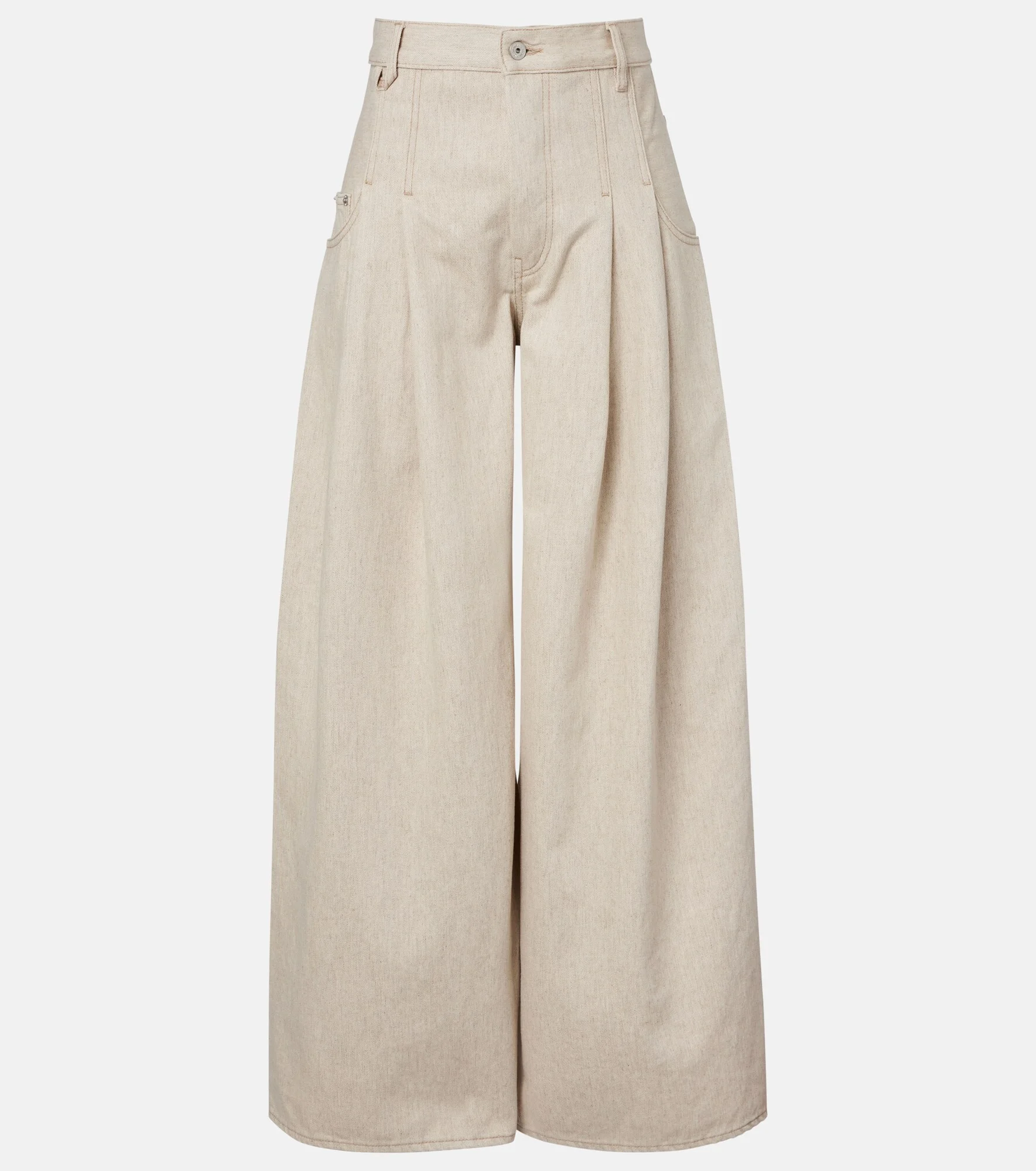 Jacquemus brings a characterful vision of French fashion to the design of every new collection. Cut from cotton-blend denim, the Souro jeans feature an ultra-high rise, wide pleated legs, and contrast topstitching. Product Details - Material: 80% cotton, 20% hemp - Care instructions: machine wash at 30 degrees - Made in Portugal - Color: beige - Designer color name: Light Beige - Lining: 65% polyester, 35% cotton - Pockets: five pockets - Closure: concealed button placket - Belt loops - Item number: P01126338 Size & Fit - True to size - Non-stretchy fabric - Wide-leg - High-rise - The model seen in the picture is 178cm-5'10" and wearing a size 26