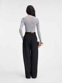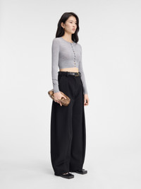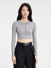 LA CASA Striped mini cardigan - Cropped, fitted shape - Striped virgin wool knit - Square collar - Fitted ribbed collar, cuffs and hem - Front buttoning with shrunken effect - Fisherman logo tag on the back - Mother-of-pearl buttons The model is 178cm and wears a size 34 100% Virgin wool Made in Romania Ref. 243KN507-2323-950