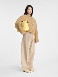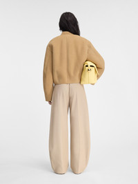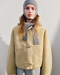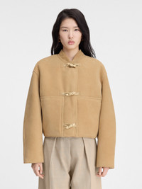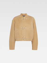 LA CASA Cropped shearling jacket - Cropped, round fit - Soft suede exterior and shearing interior - Bomber stand collar - Topstitched details - Toggle fastenings - Stitched patch pockets with side opening - Back darts - Fully lined - 3 Branderburg buttons The model is 178cm and wears a size 34 100% Sheepskin Made in France Ref. 243CO073-1663-130