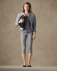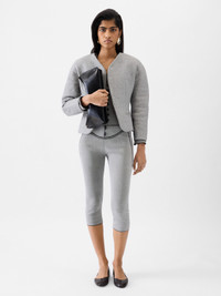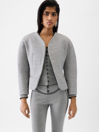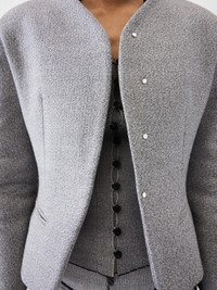 Cropped fitted jacket - Cropped fitted shape - Bonded, textured tailoring wool - Collarless - Cropped rounded sleeves - Hidden buttoned closure - Fitted waist - Jetted pockets The model is 171cm and wears a size 34 71% Cotton - 29% Virgin Wool / Lining: 52% Viscose - 48% Cotton Made in France Ref. JAW00103AW00657910