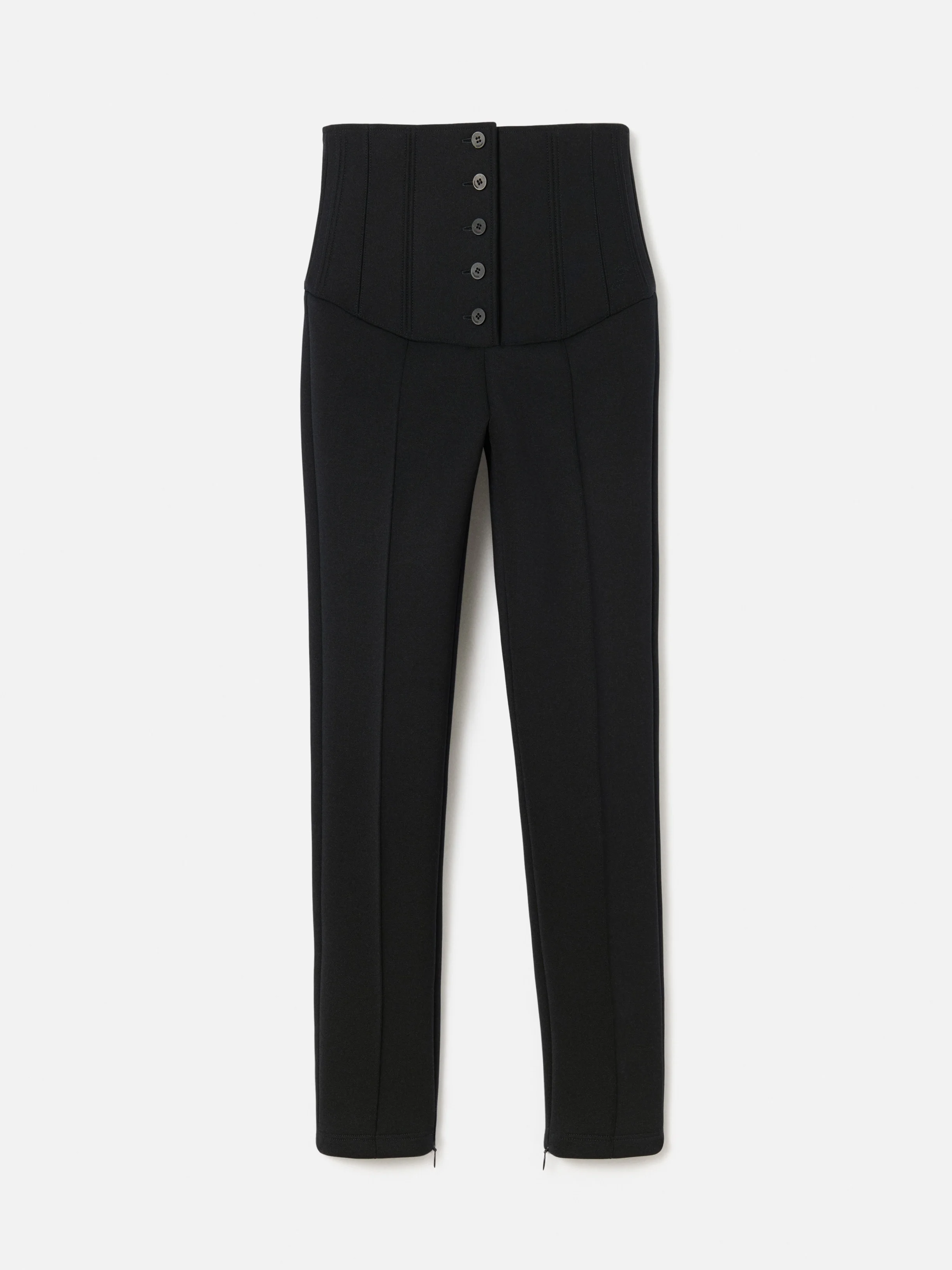 Corset capri pants - High-rise - Stretch poly-wool - Corseted waistband - Visible tone-on-tone buttoned fly - Fitted leg - Invisible zippers on the calves - Buttoned fastening detail on the back waist - Horn buttons The model is 178cm and wears a size 34 53% Polyester - 42% Virgin wool - 5% Elastane Made in Bulgaria Ref. PAW00638AW00733990