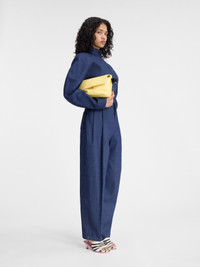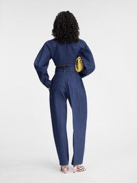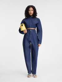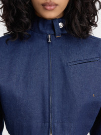 LA CASA Cropped denim moto jacket - Cropped, round fit - Raw indigo denim - Stand collar with ajustable stud fasteners - Contrast stitching - Double zip closure - Rounded sleeves - Zipped chest pocket - Back yoke - “J” locker loop - Adjustable belt on the back with metal buckle - Adjustable snap button cuffs - Silver metal hardware - Fully lined The model is 178cm and wears a size 34 100% Cotton Made in Italy Ref. 243DE052-1513-380