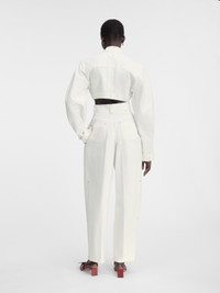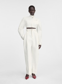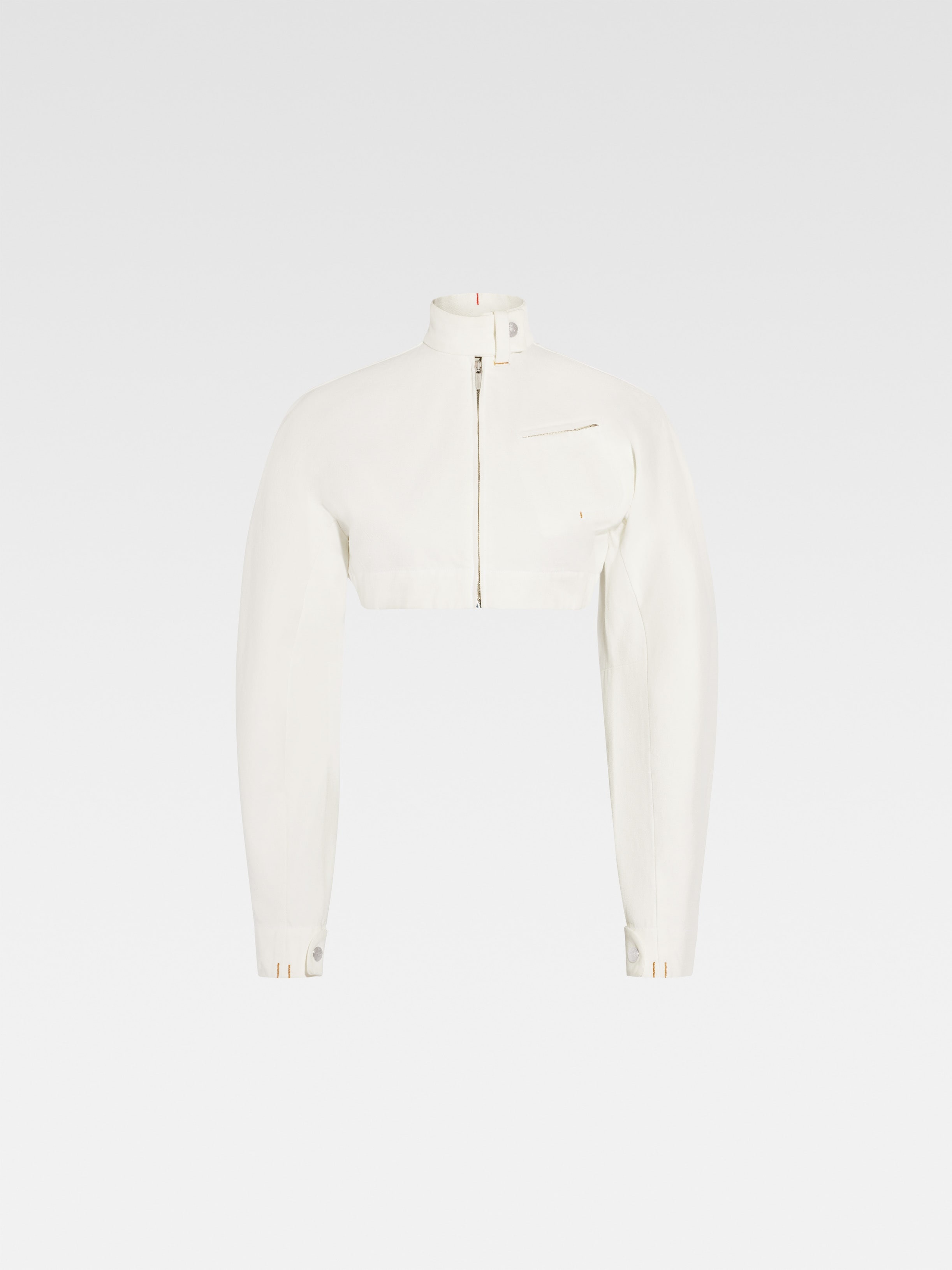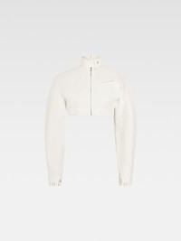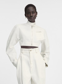LA CASA Cropped denim moto jacket - Cropped, round fit - Off-white denim - Stand collar with ajustable stud fasteners - Contrast stitching - Double zip closure - Rounded sleeves - Zipped chest pocket - Back yoke - “J” locker loop - Adjustable belt on the back with metal buckle - Adjustable snap button cuffs - Silver metal hardware - Fully lined The model is 177cm and wears a size 34 100% Cotton Made in Italy Ref. 243DE052-1514-110